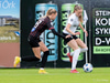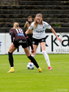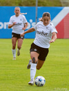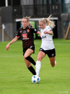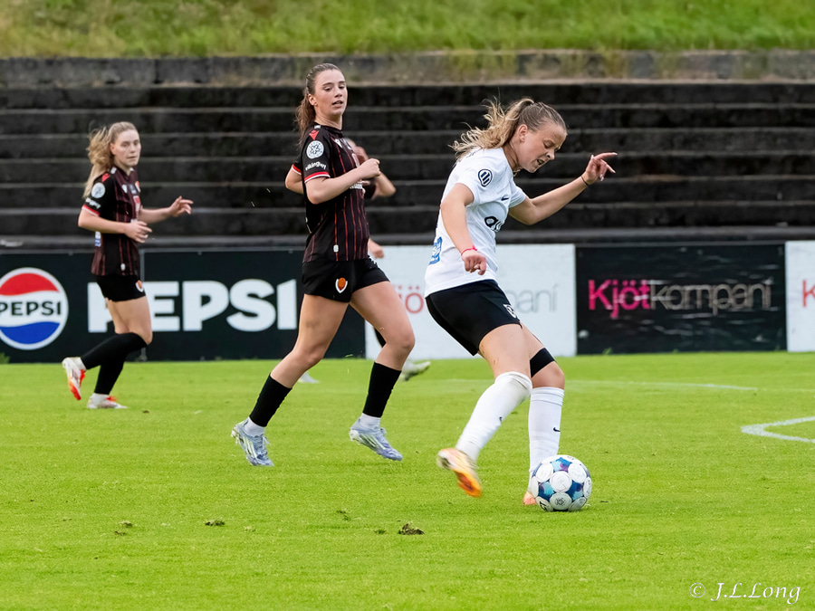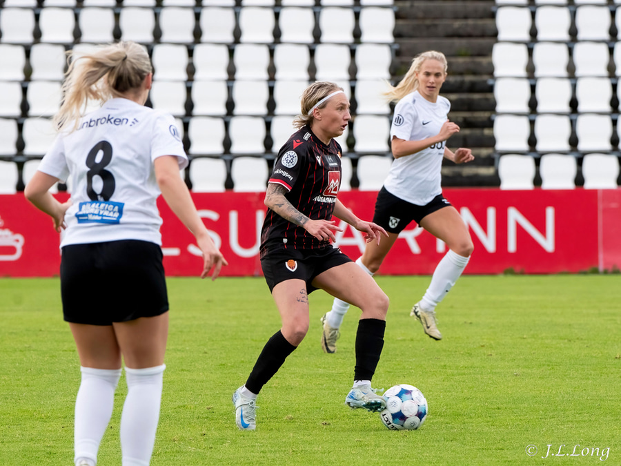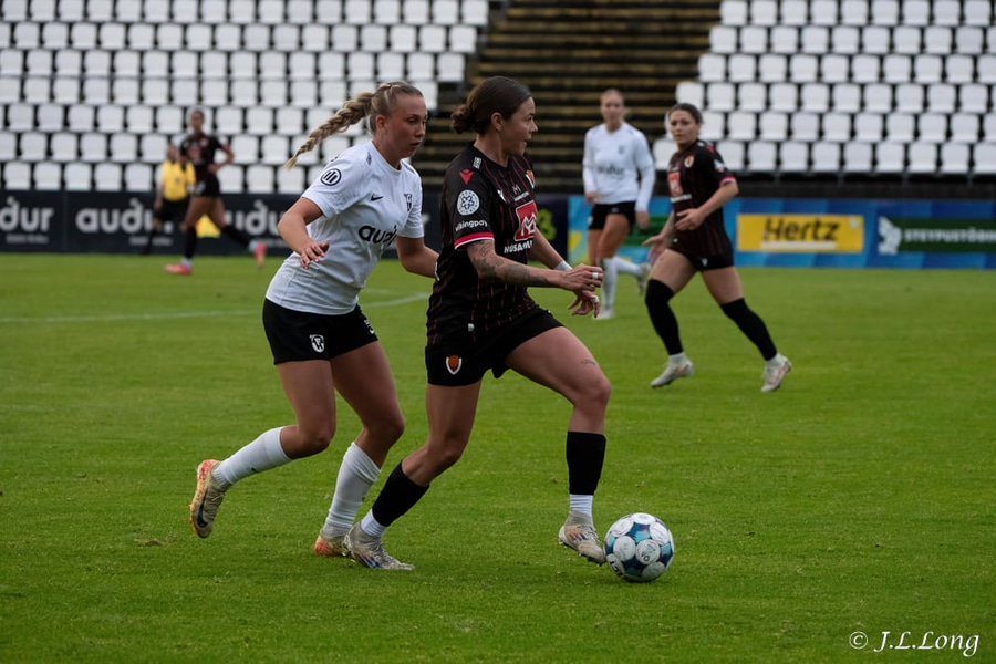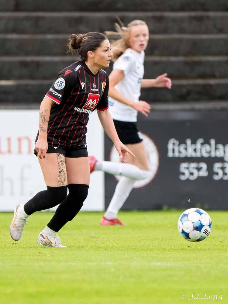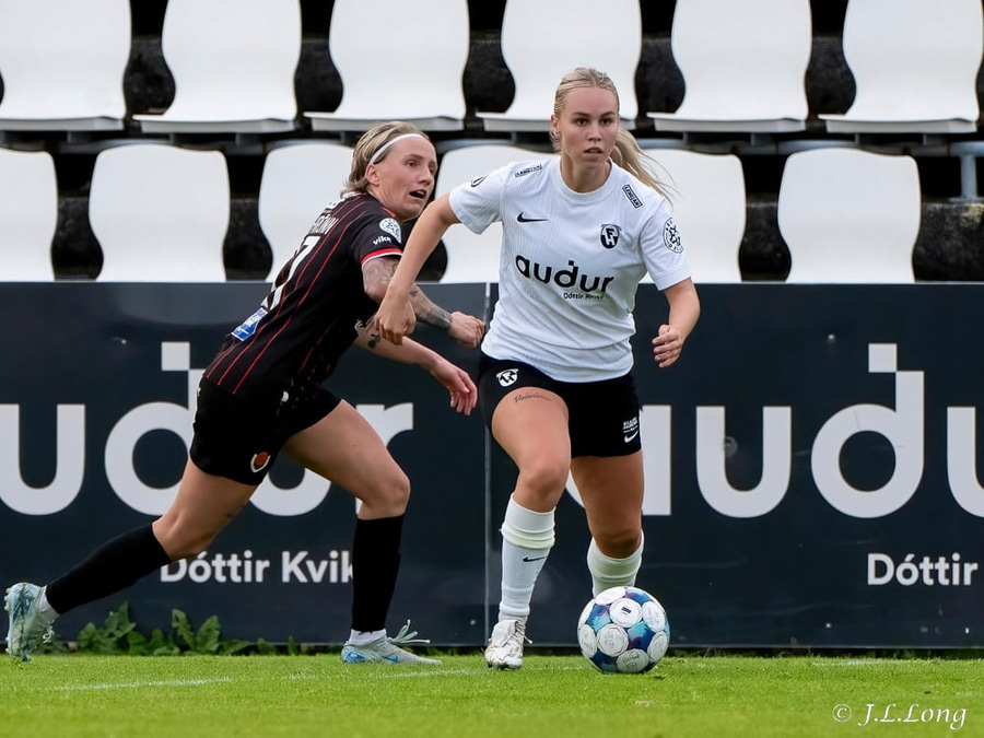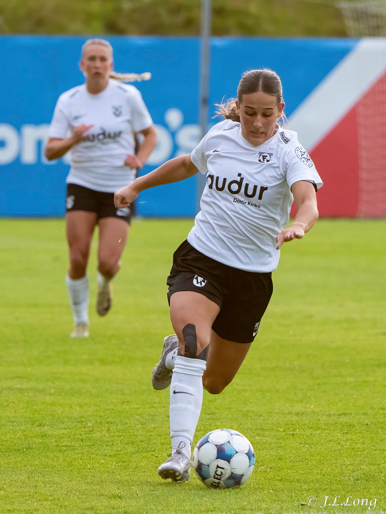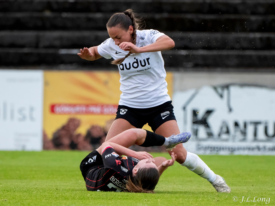 Ashley kemur með bolta inn fyrir á Bergdísi sem þarf að rekja boltann aðeins upp völlinn og á svo skot beint á markið