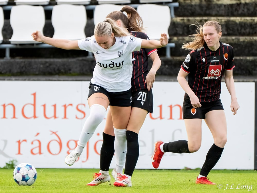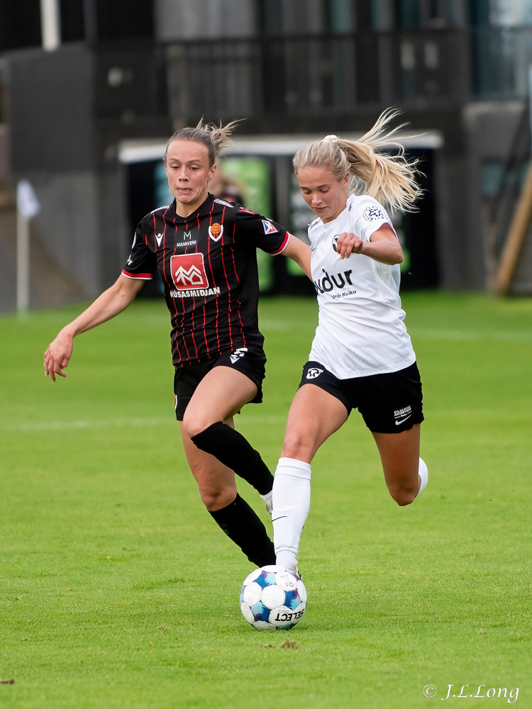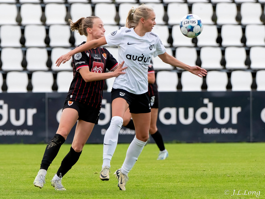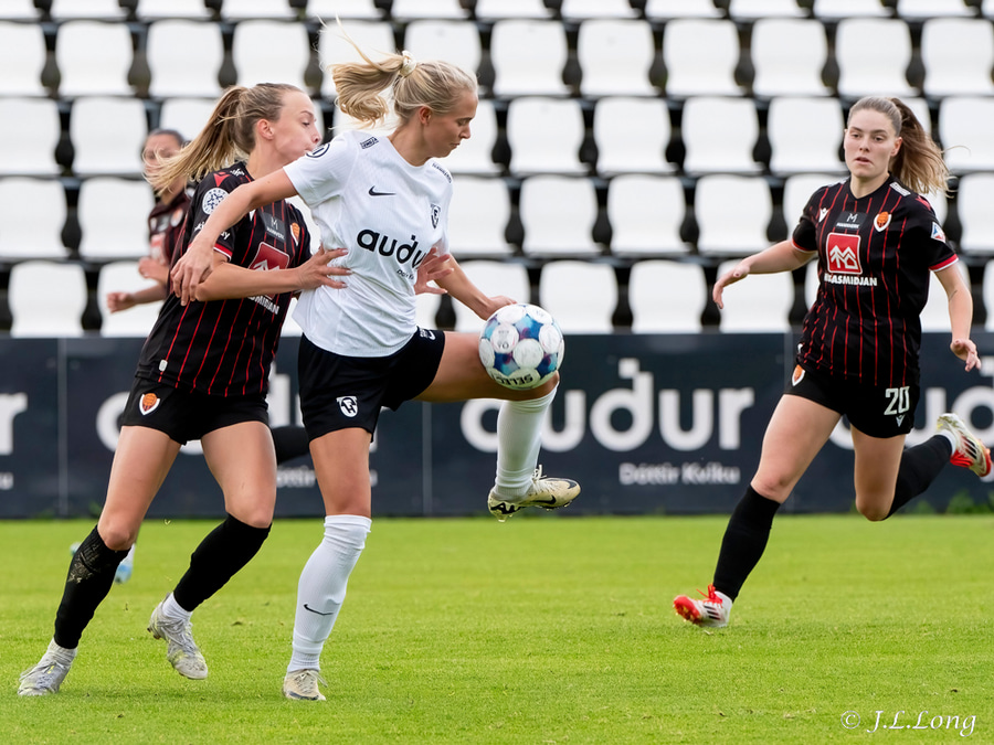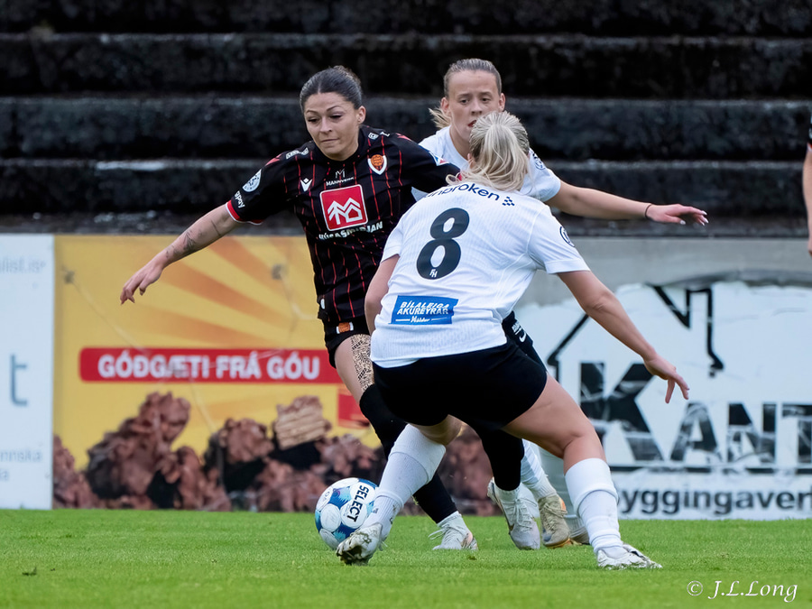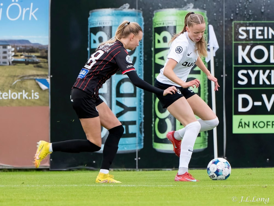 Thelma með góðan bolta út í teiginn beint á Mayu Hansen sem ætlar að reyna fara framhjá tveimur en tapar boltanum
