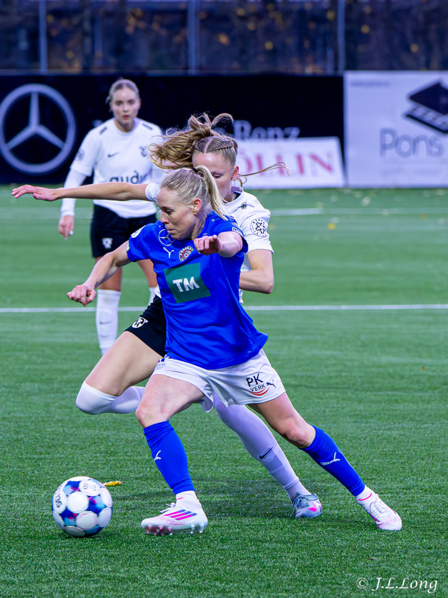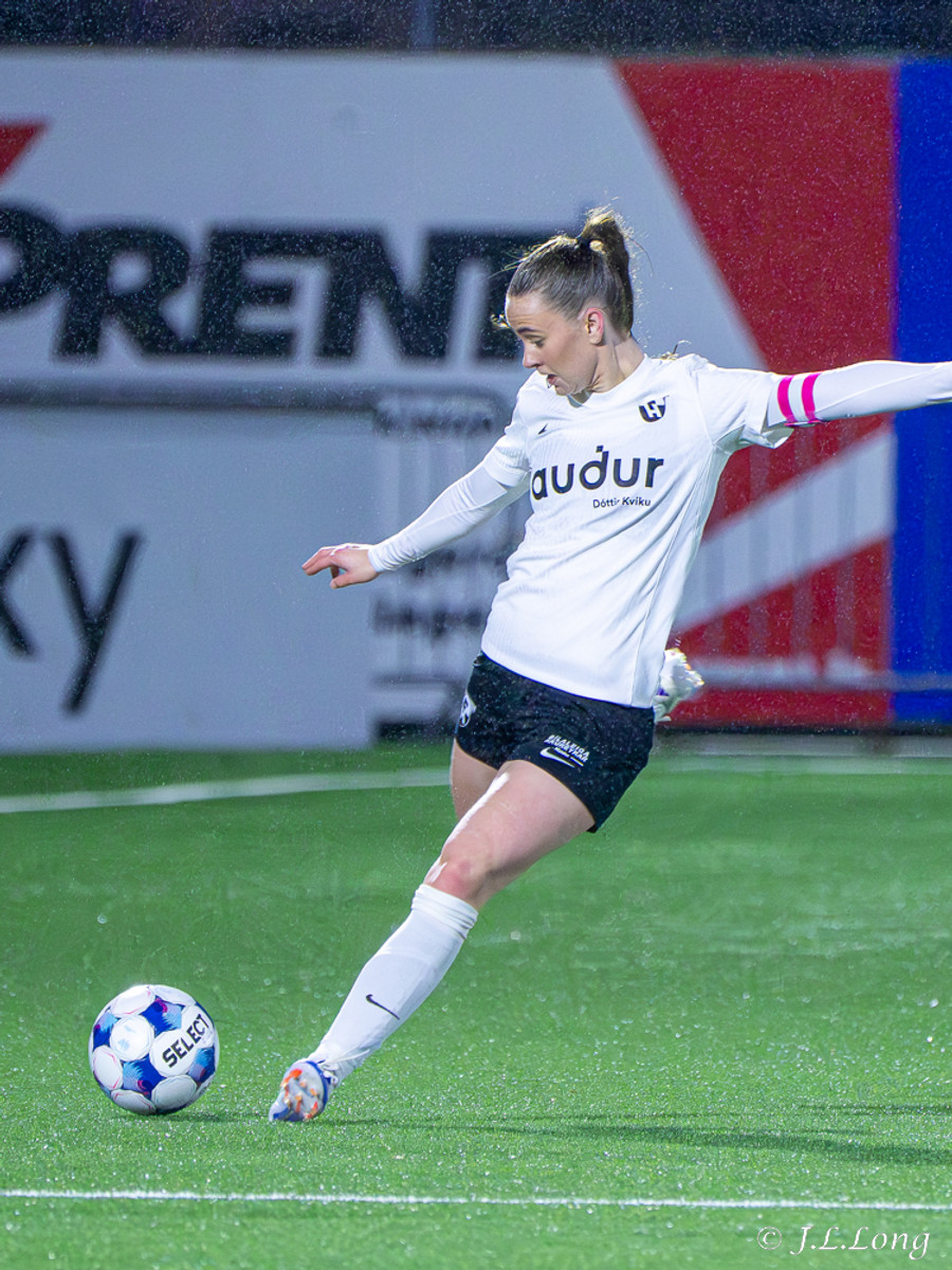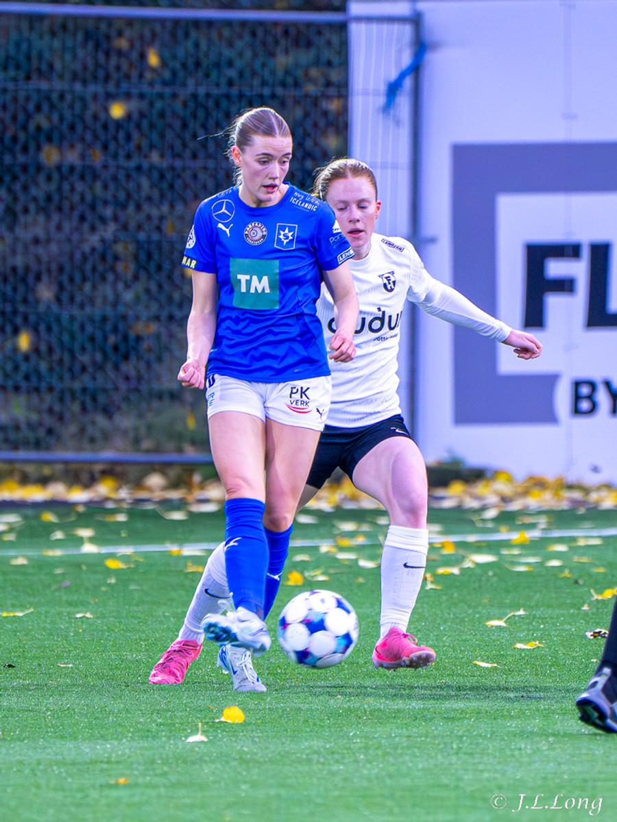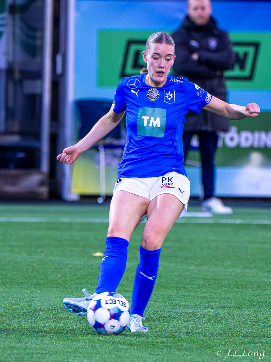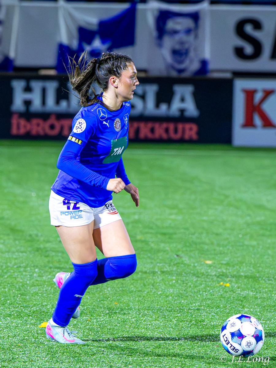 Thelma Karen upp hægri kantinn aftur en boltinn dettur fyrir markspyrnu, Hassett var ekkert að pæla í henni