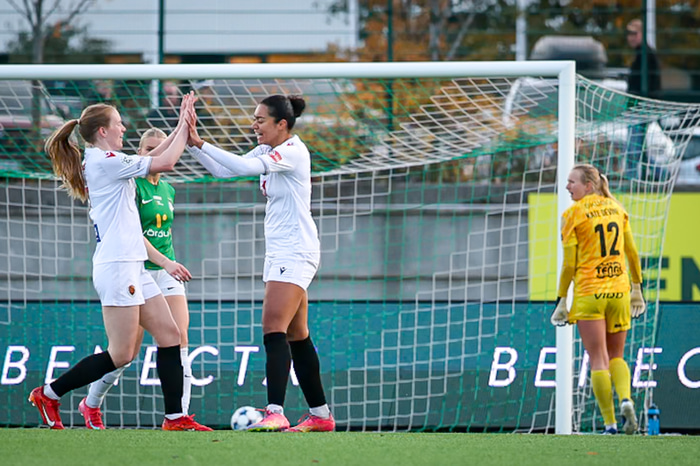 Ashley Clark tekur aukaspyrnuna og nær að koma boltanum fram hjá veggnum og á markið. Katherine Devine er þó mætt til að verja skotið og gerir það.