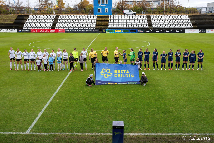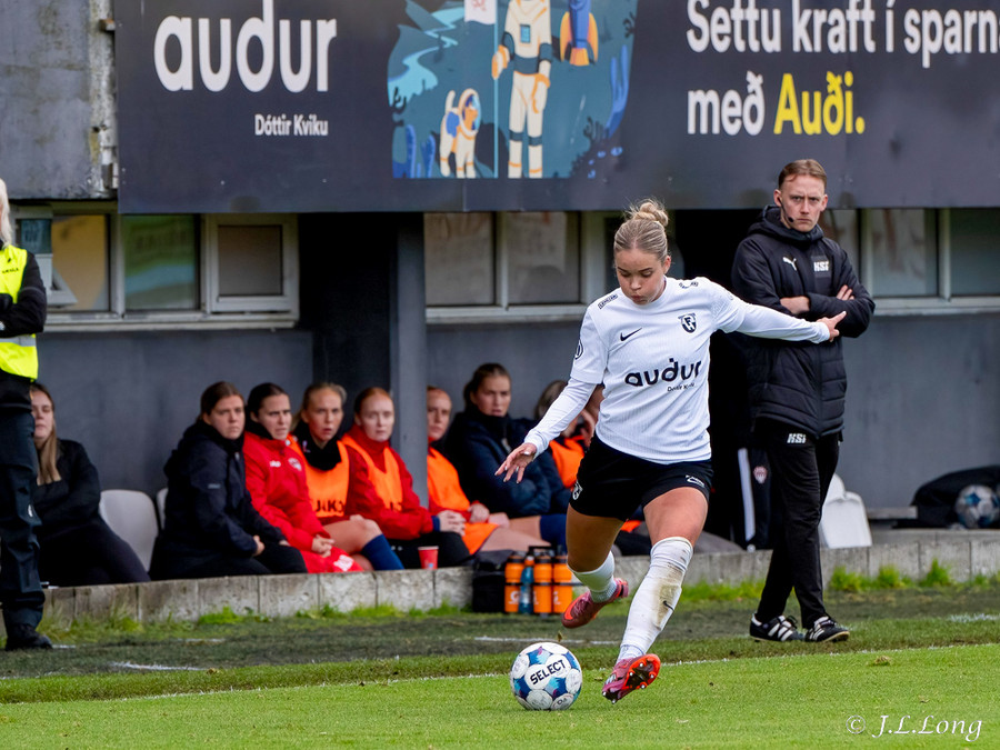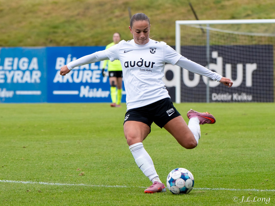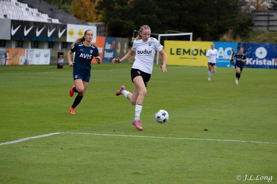 Thelma Lóa fær sendingu upp í horn, hún er komin á sprettinn en flaggið fer á loft