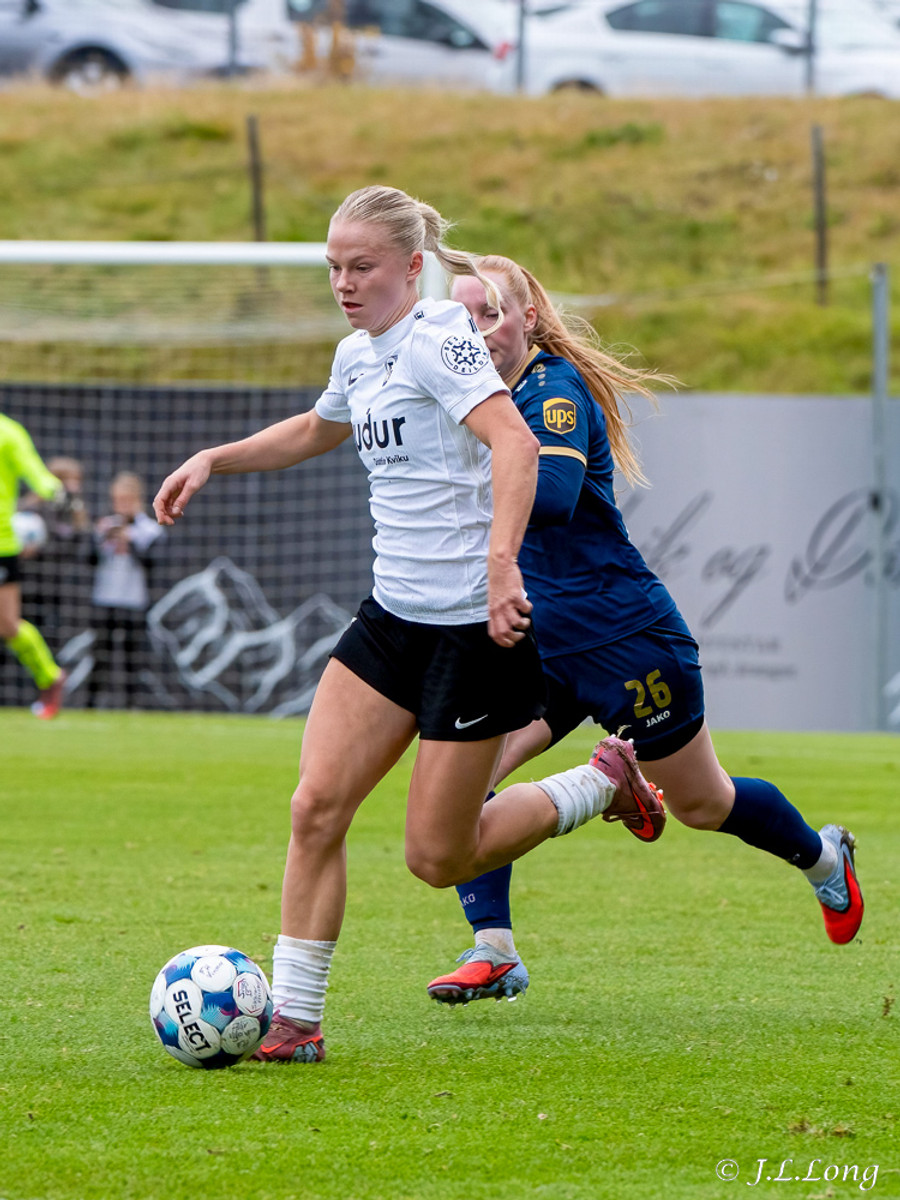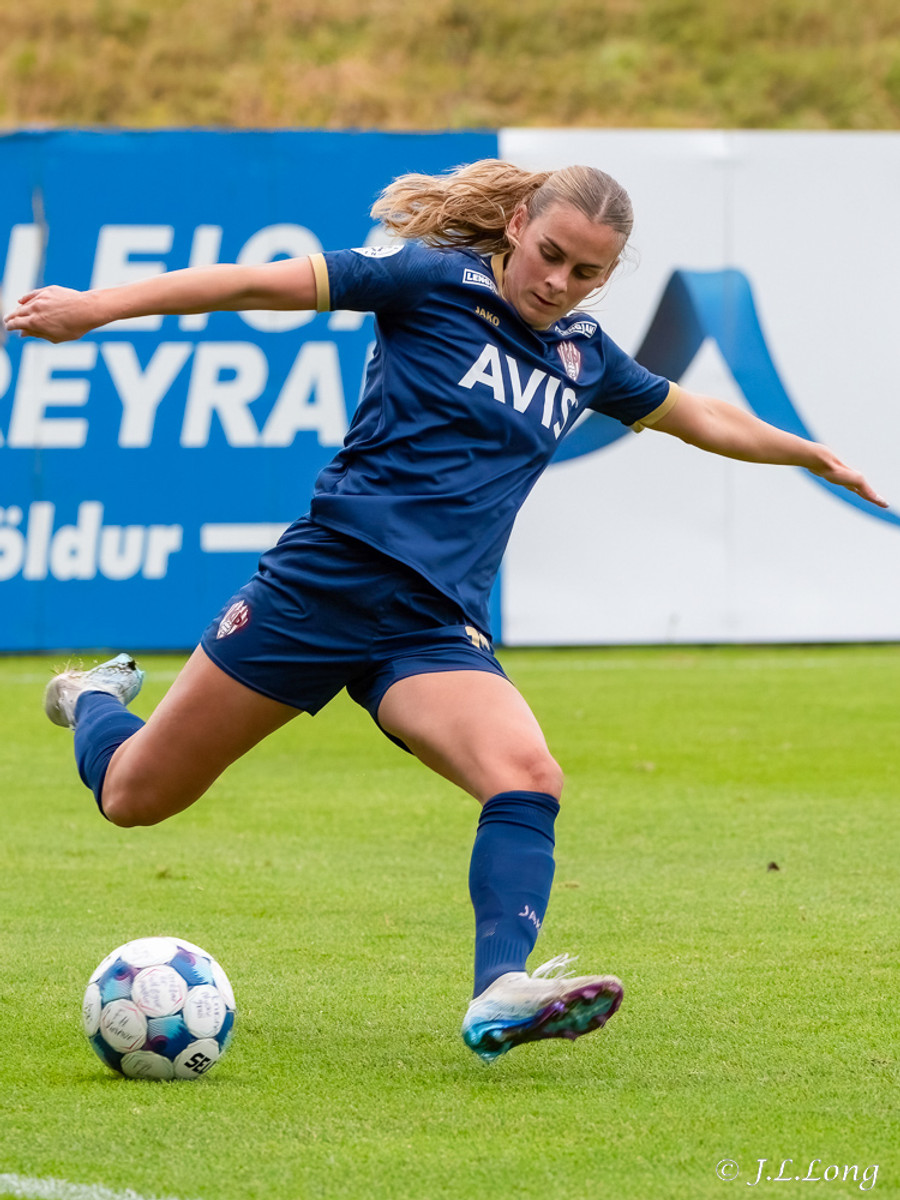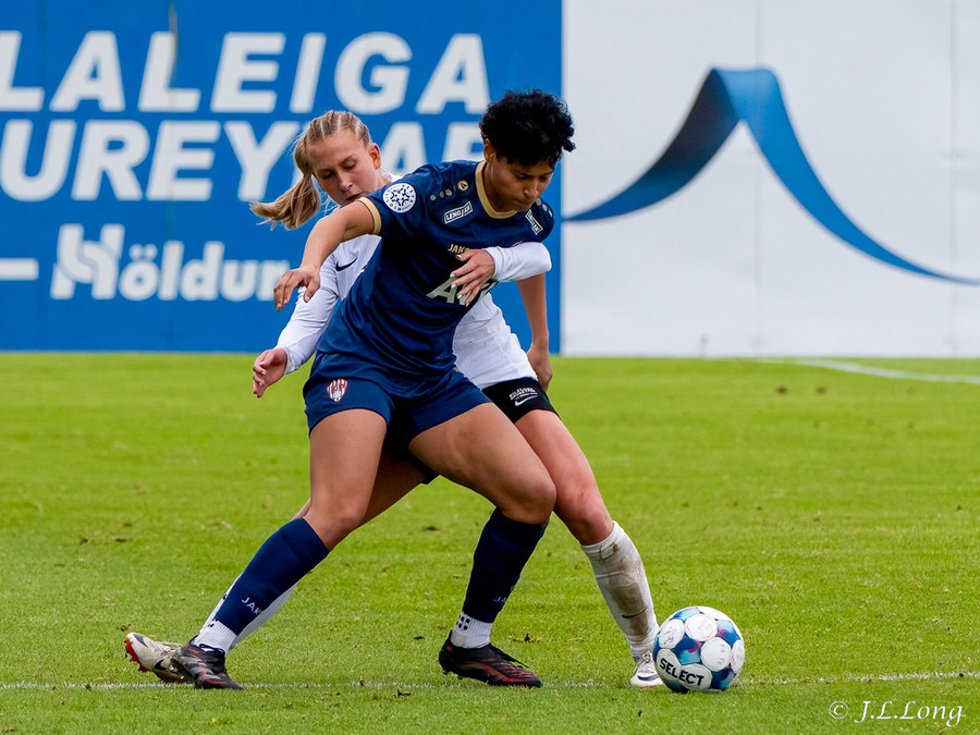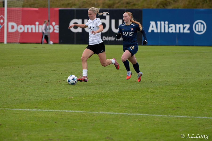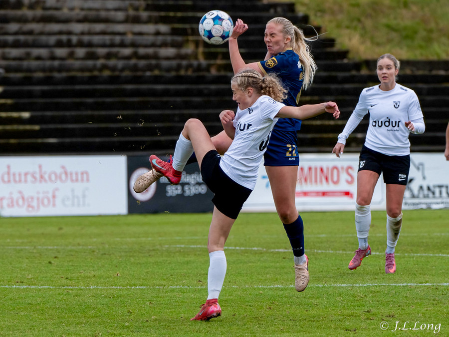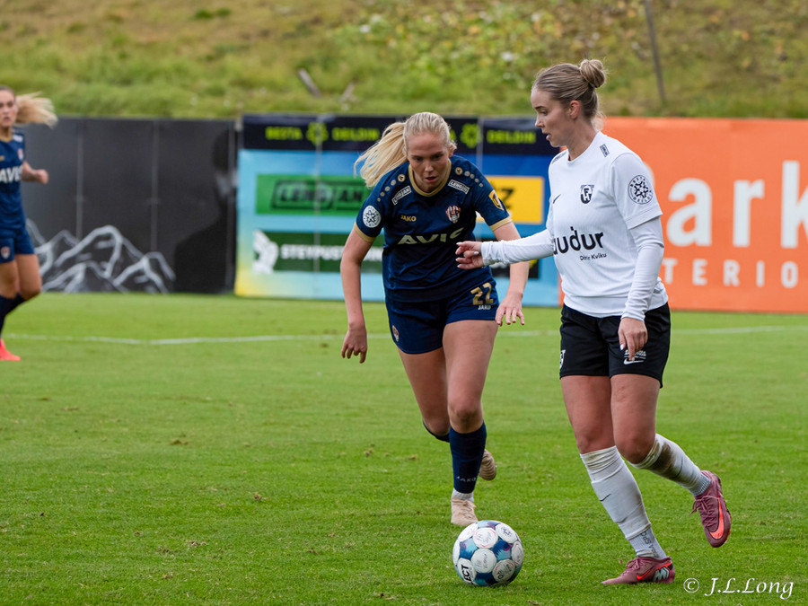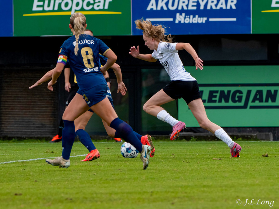 Thelma lóa setur hann inn í teig þar er Ingibjörg mætt, tekur hann á lofti bara og stýrir honum í fjærhornið