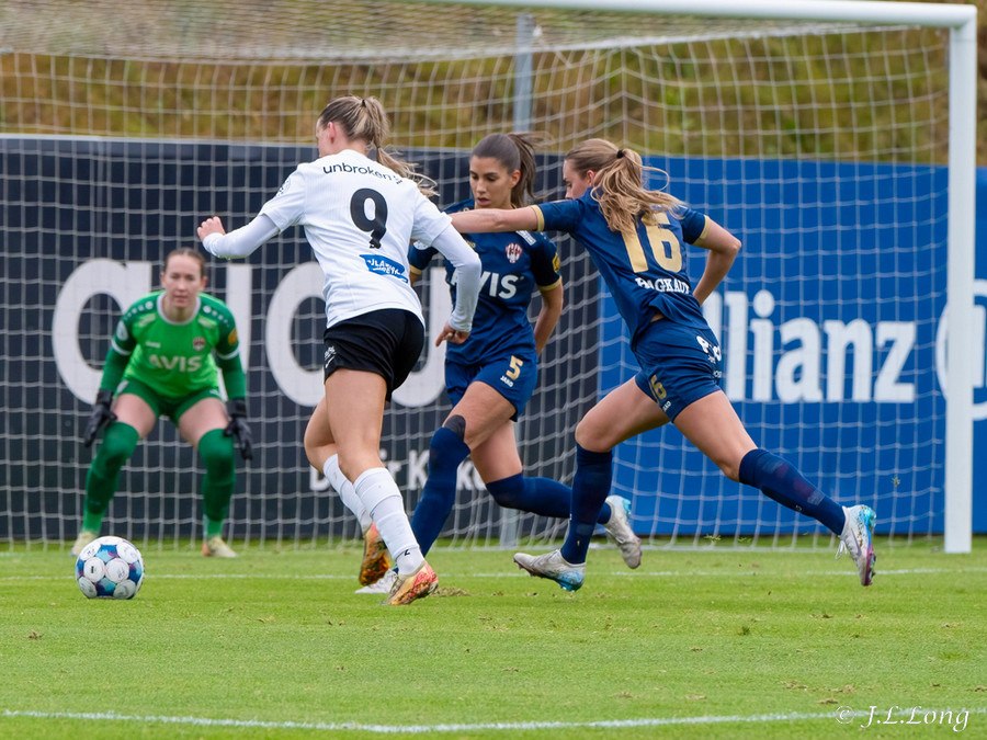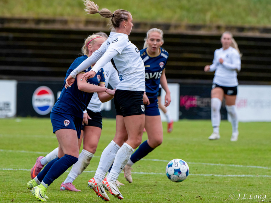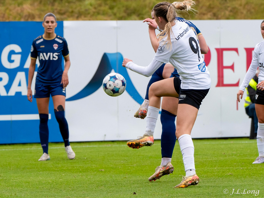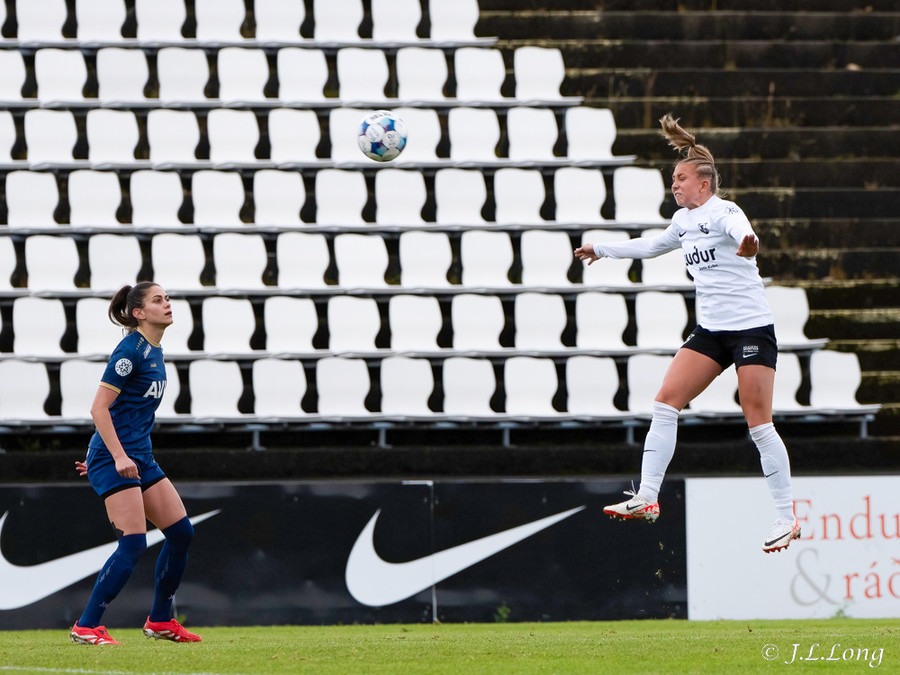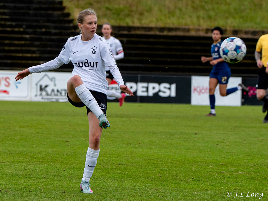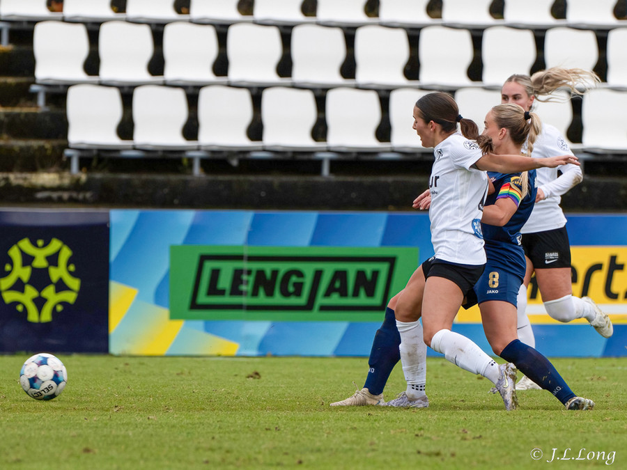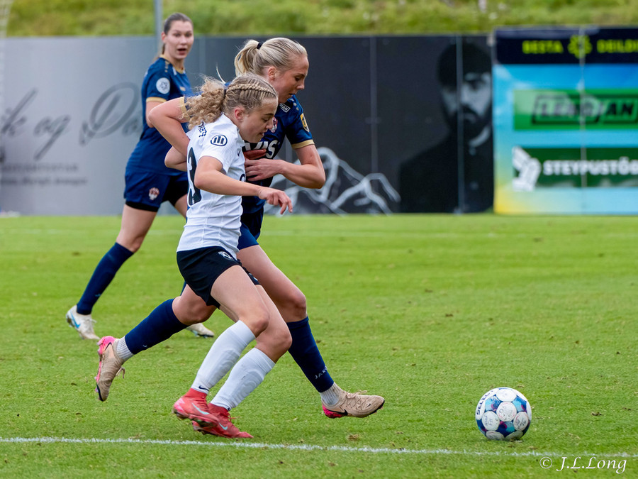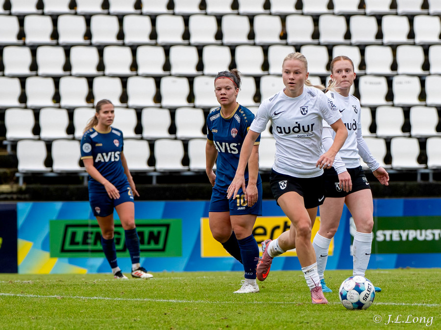 Thelma lóa setur hann inn í teig þar er Ingibjörg mætt, tekur hann á lofti bara og stýrir honum í fjærhornið