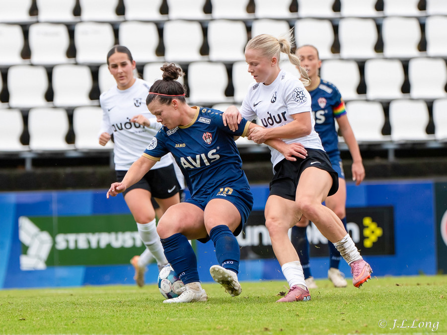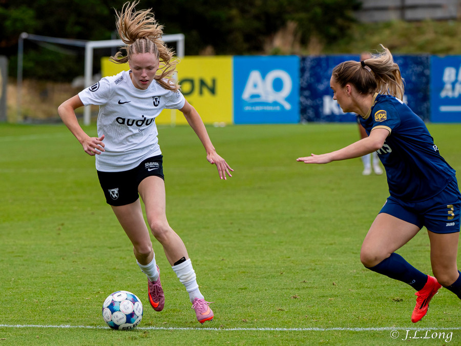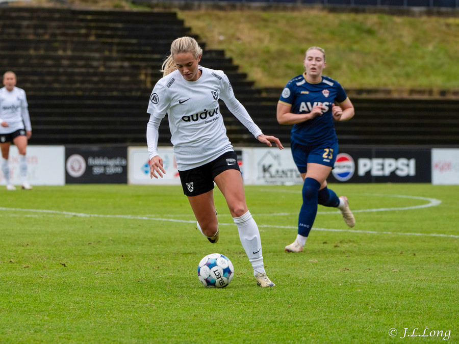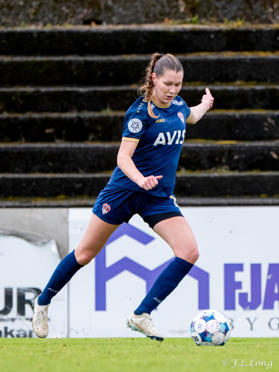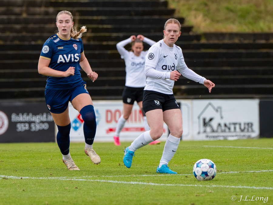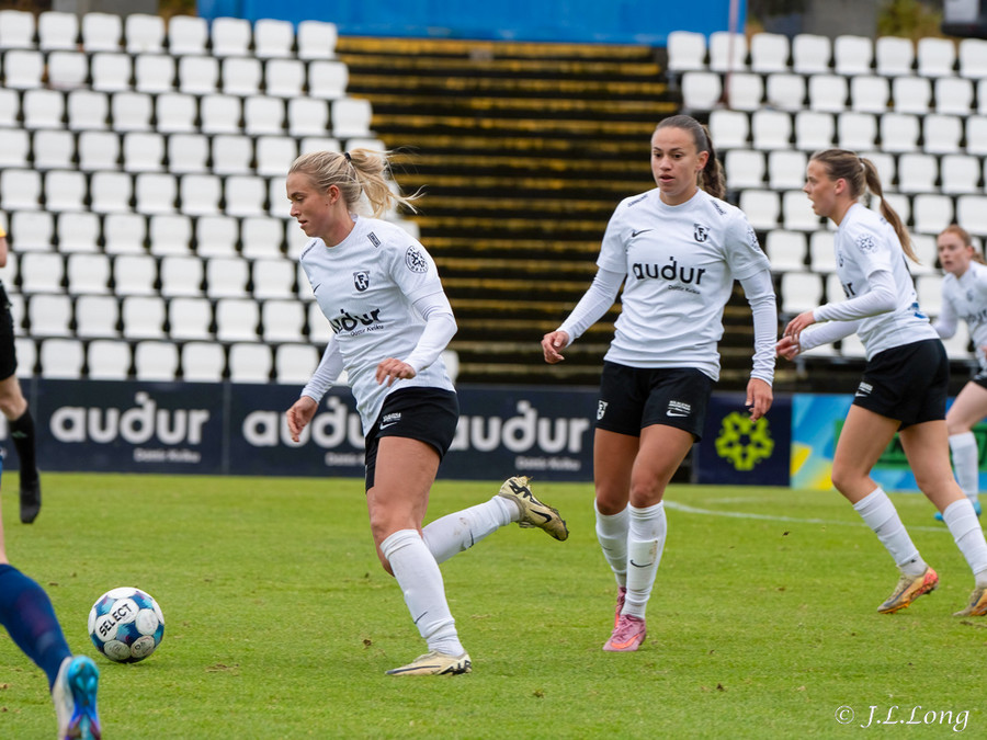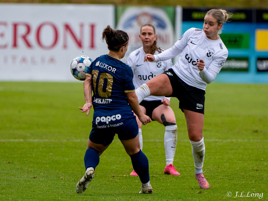 Thelma lóa setur hann inn í teig þar er Ingibjörg mætt, tekur hann á lofti bara og stýrir honum í fjærhornið