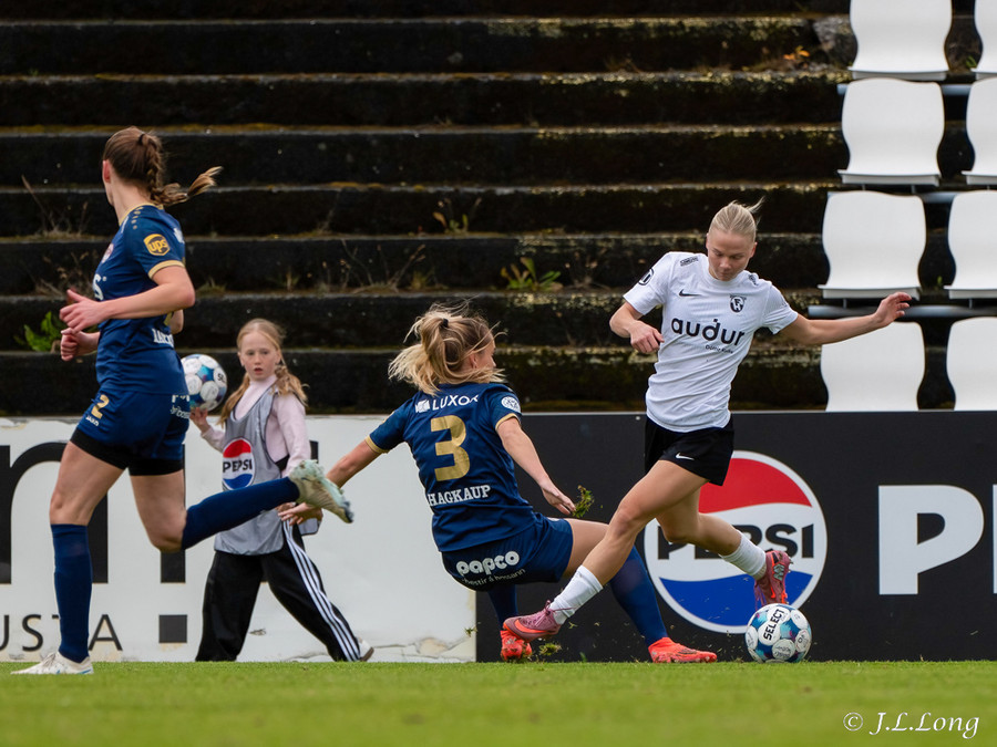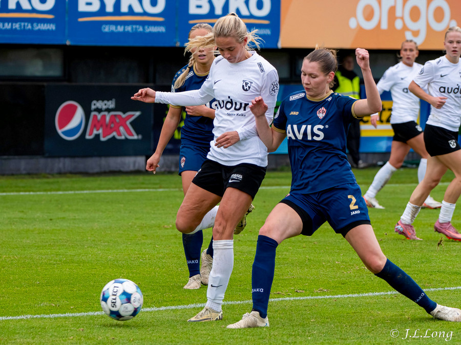 Þórdís Elva reynir lúmska fyrirgjöf en varnarmenn FH komast í sendinguna á síðustu stundu, þetta var hættulegt flri