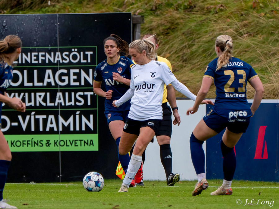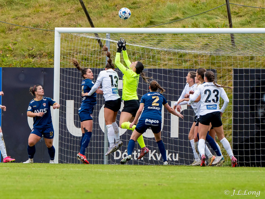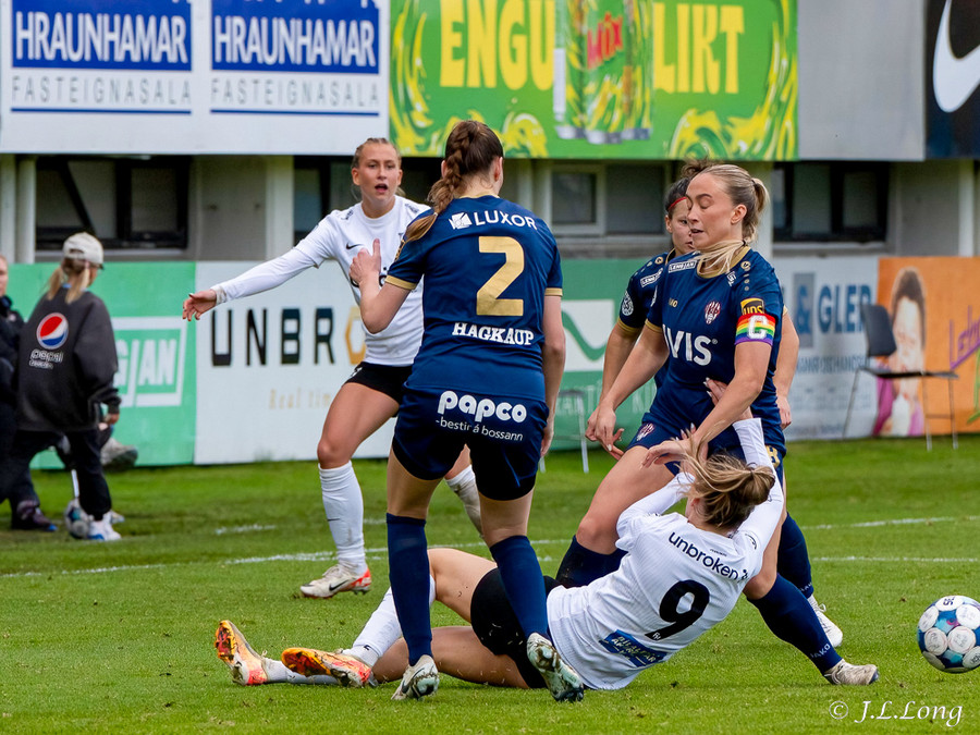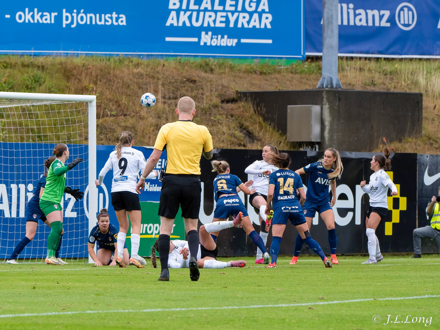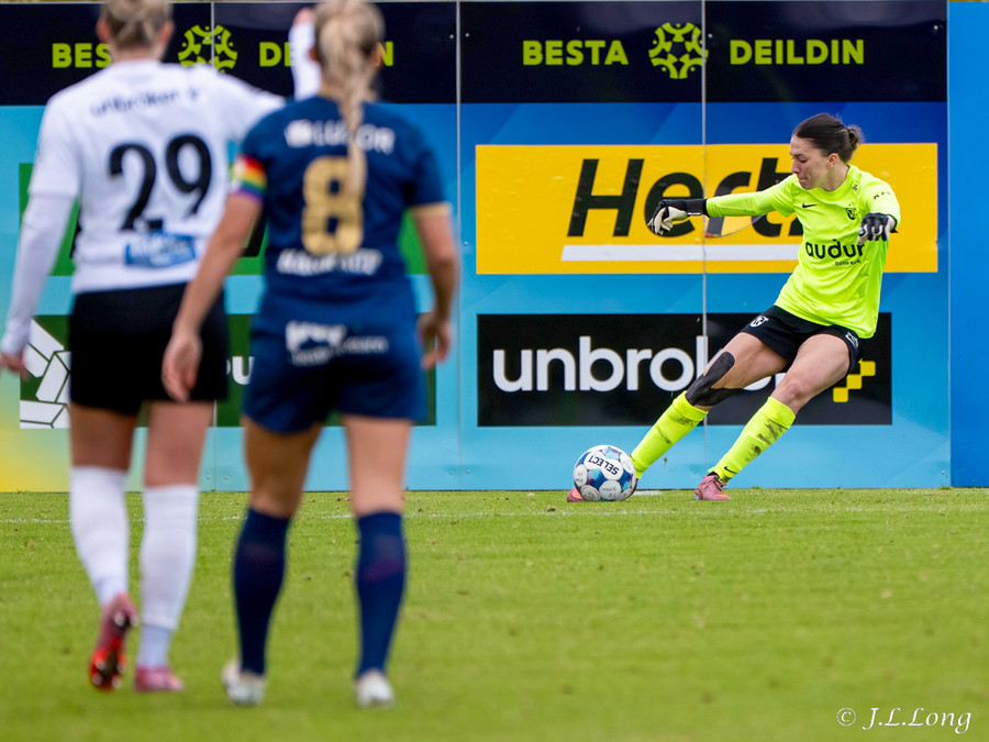 Valgerður á hér skot í fjærstöngina, boltinn kemur til hennar aftur og þá setur hún hann í nærstöngina