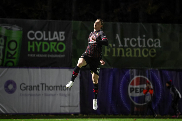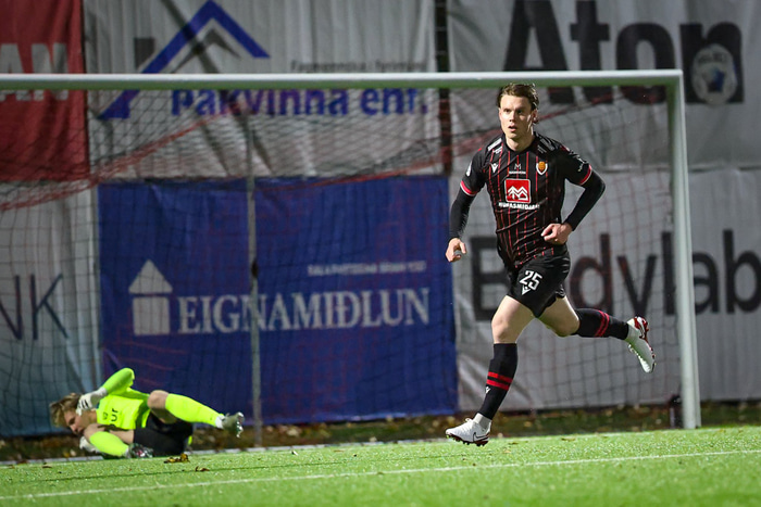 Hrikaleg mistök hjá Tómasi Orra sem fær boltann frá markmanni, hann snýr og veit ekki af Gylfa fyrir aftan hann sem er að koma í pressuna. Gylfi potar boltanum áfram á Valdimar sem er þá kominn í dauðafæri og klárar mjög vel!