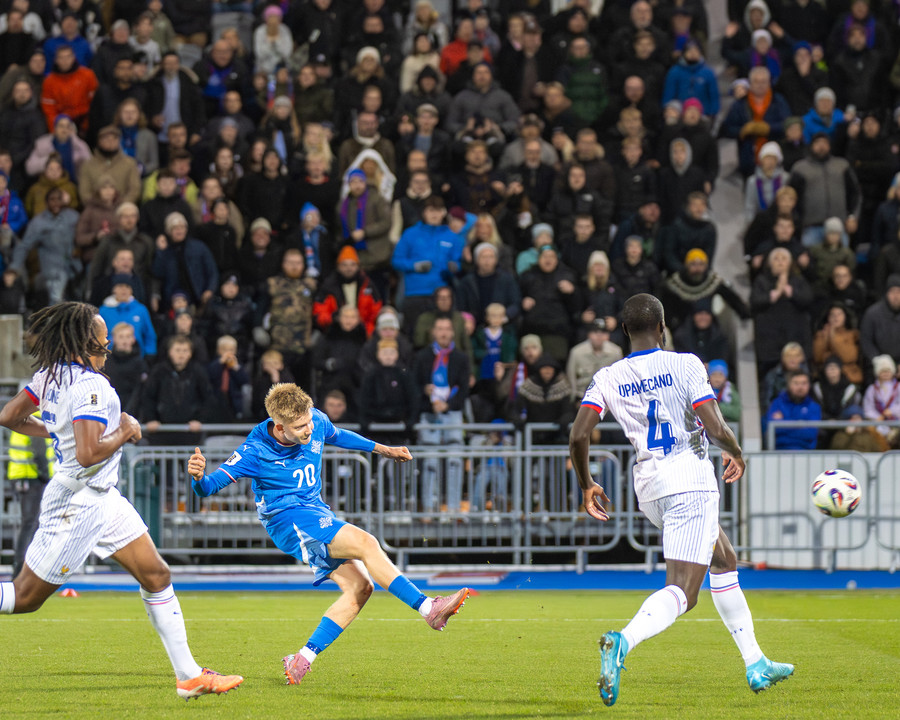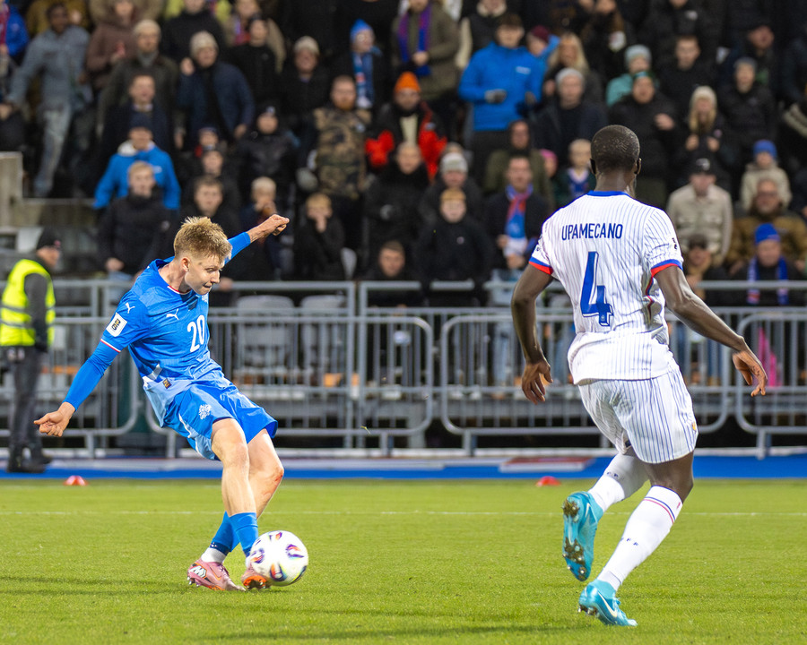 Fyrst er Albert með frábæra takta á vinstri kantinum og kemur með fyrigjöfina en hún er skölluð frá. Ísland heldur boltanum því Hákon tekur einhvern svakalegan snúning á miðjum vellinum, kemur honum svo á Mikael sem er dauðafrír á vinstri en fyrirgjöfin hans er eiginlega bara arfa slök og fer framhjá markinu.
