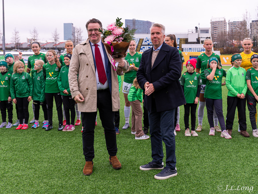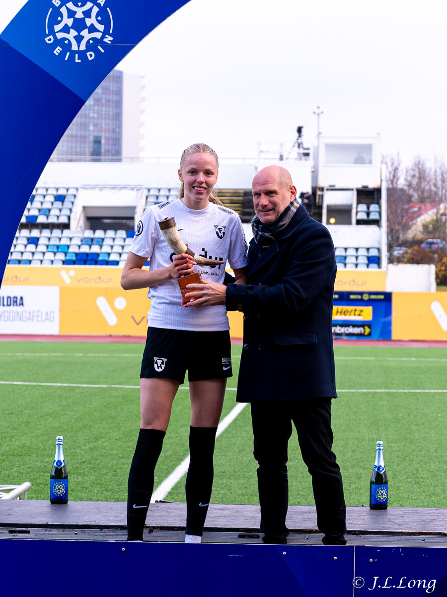 Formaður FH gaf formanns Breiðabliks blóm fyrir þeirra árangur í sumar. Andrea Rut Bjarnadóttir fær heiðursverlaun fyrir hennar 100 leik. Kristín Dís fær hér verðlaun fyrir hennar 200 leik. Berglind Björg fær líka verðlaun fyrir að vera markahæsti leikmaður í sögu Breiðabliks á einu tímabili. Nóg af verðlaunu í dag.
