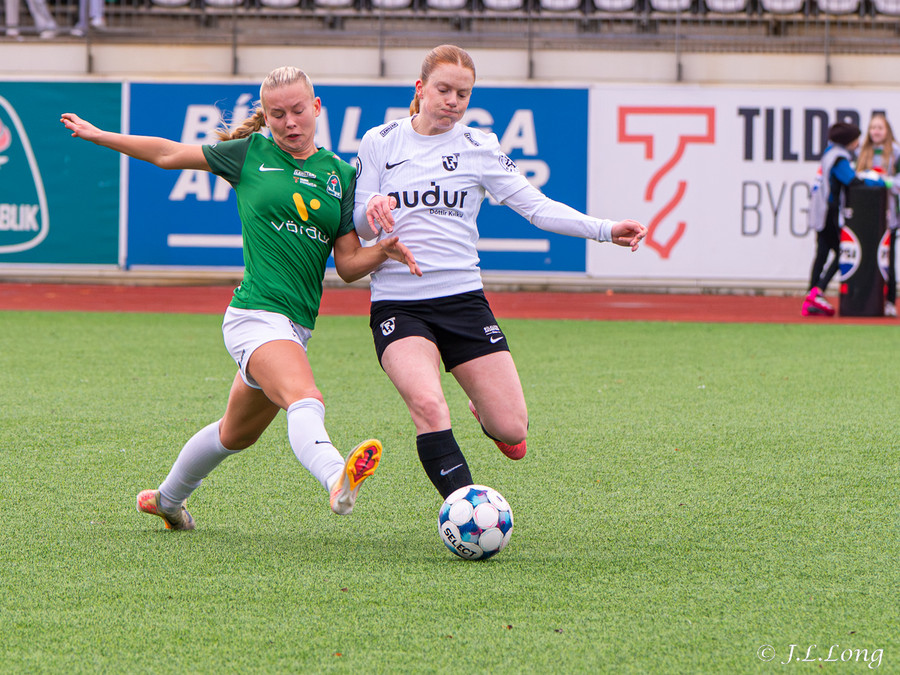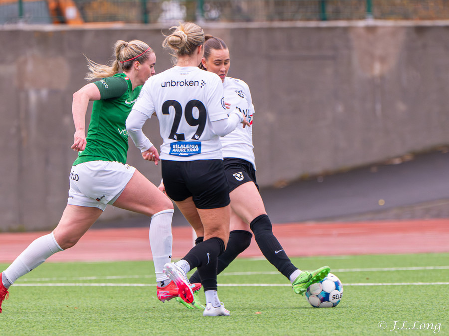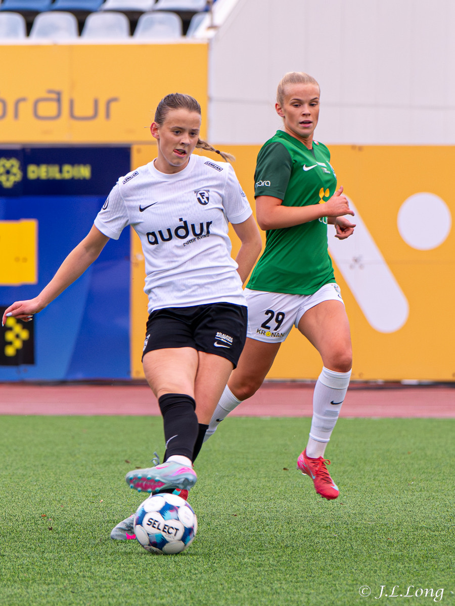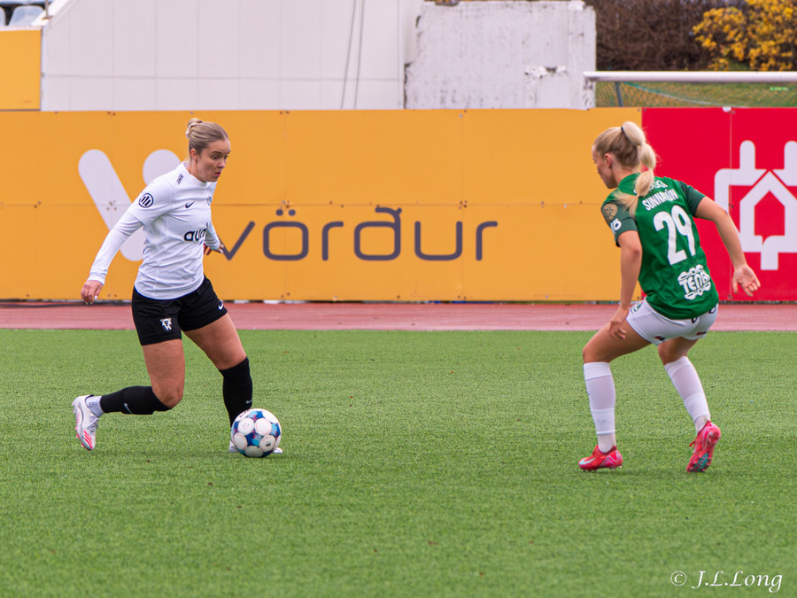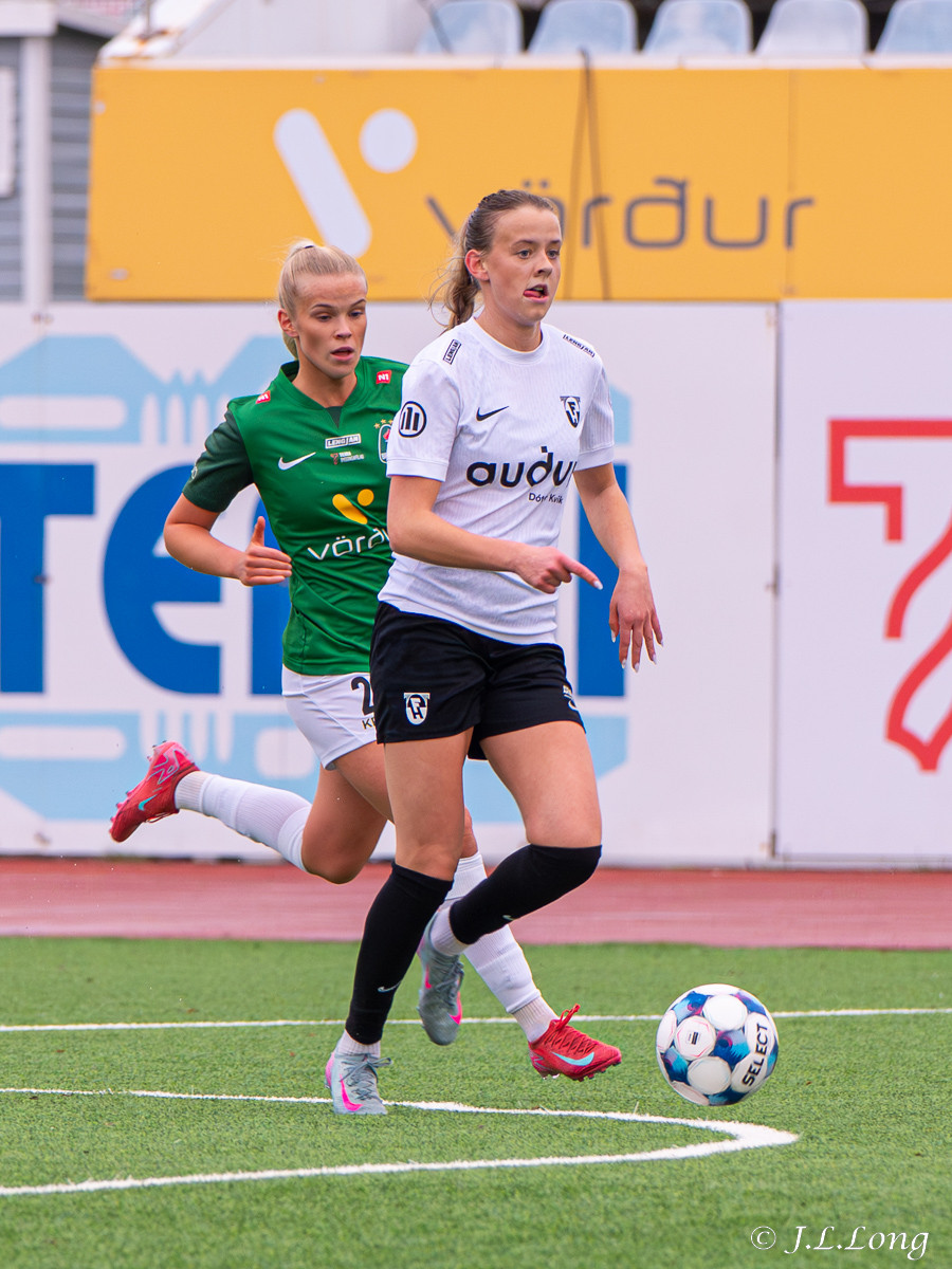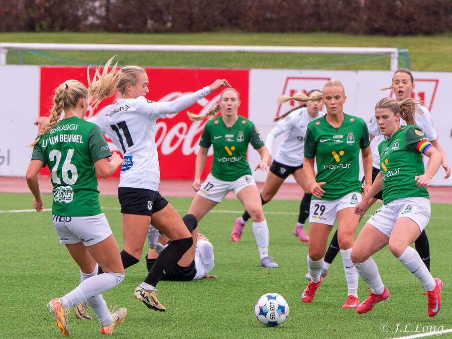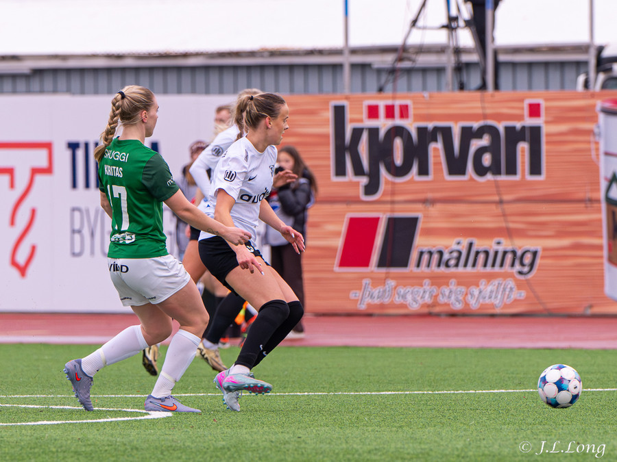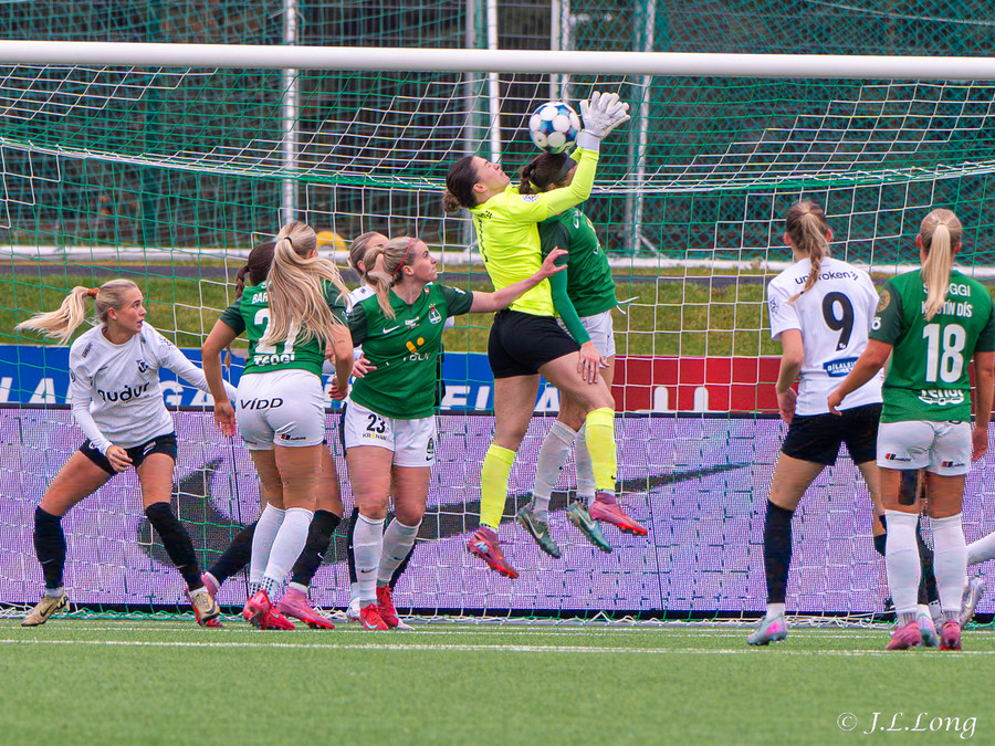 Boltinn skoppast inn í teignum en endar með skot frá Birnu Kristínu sem endar yfir markið.
