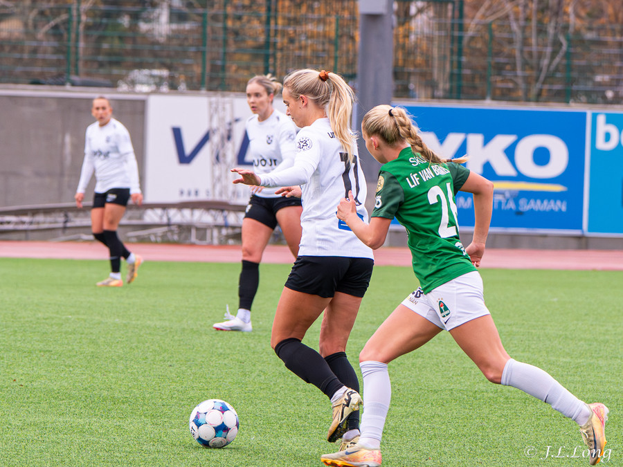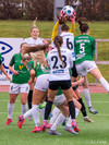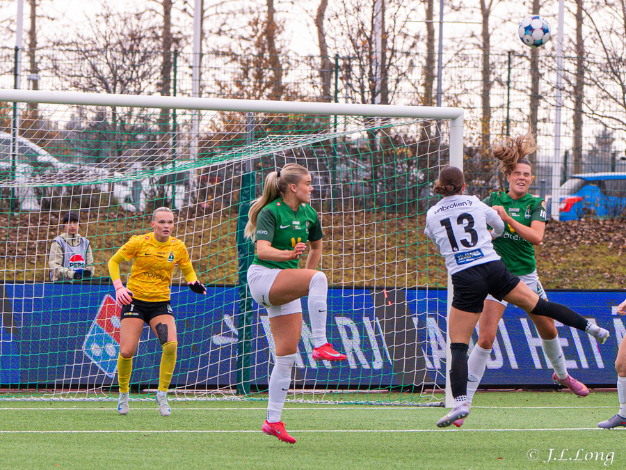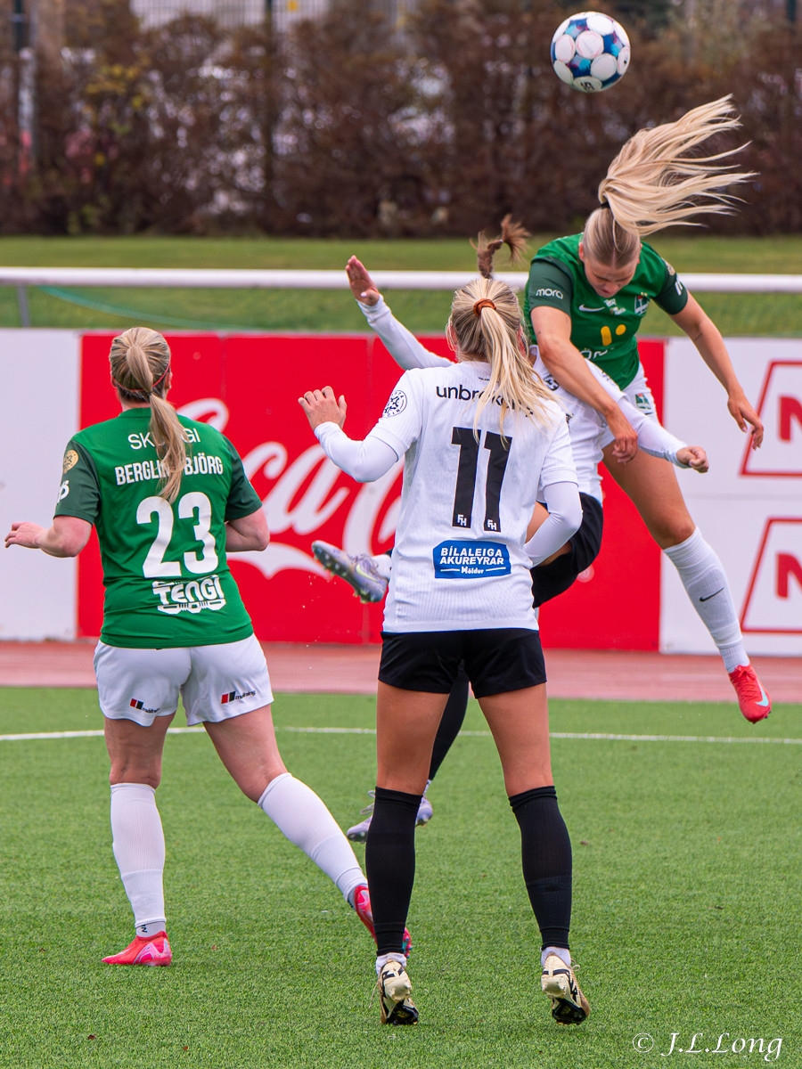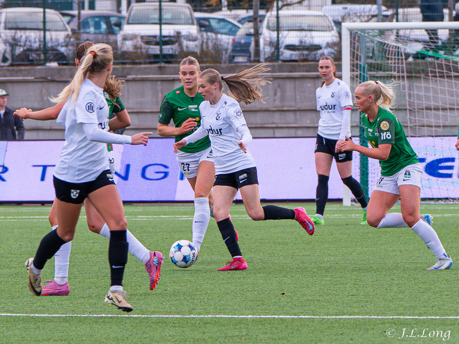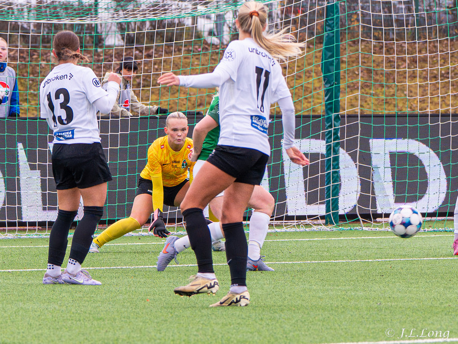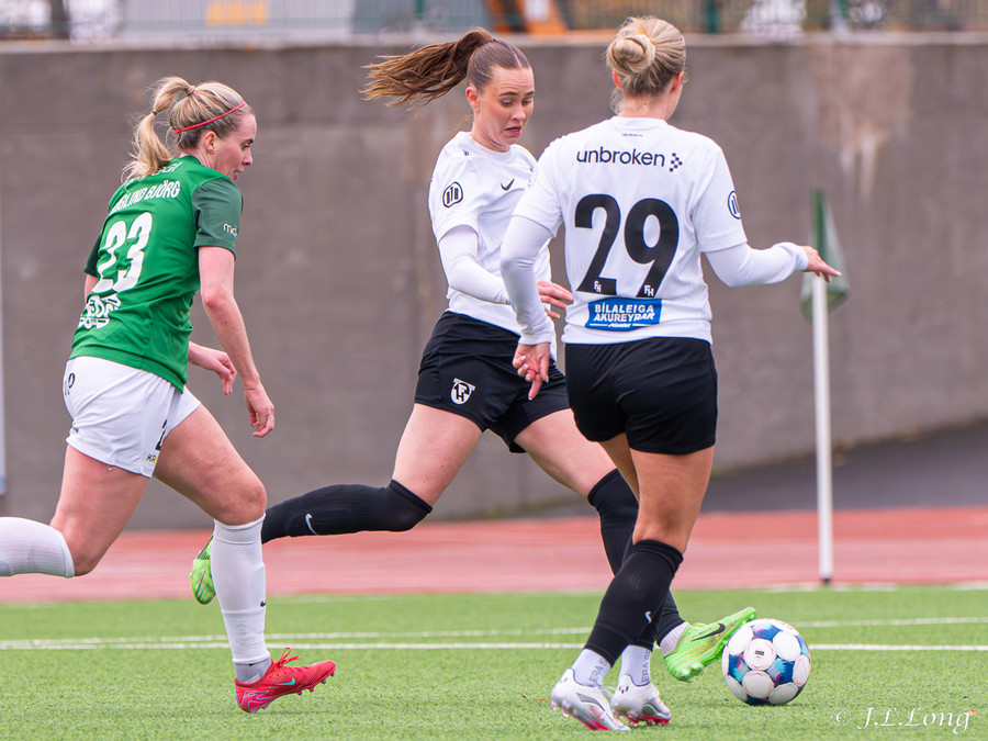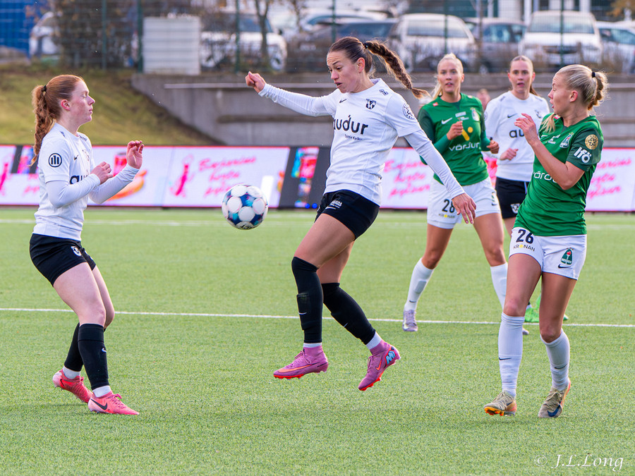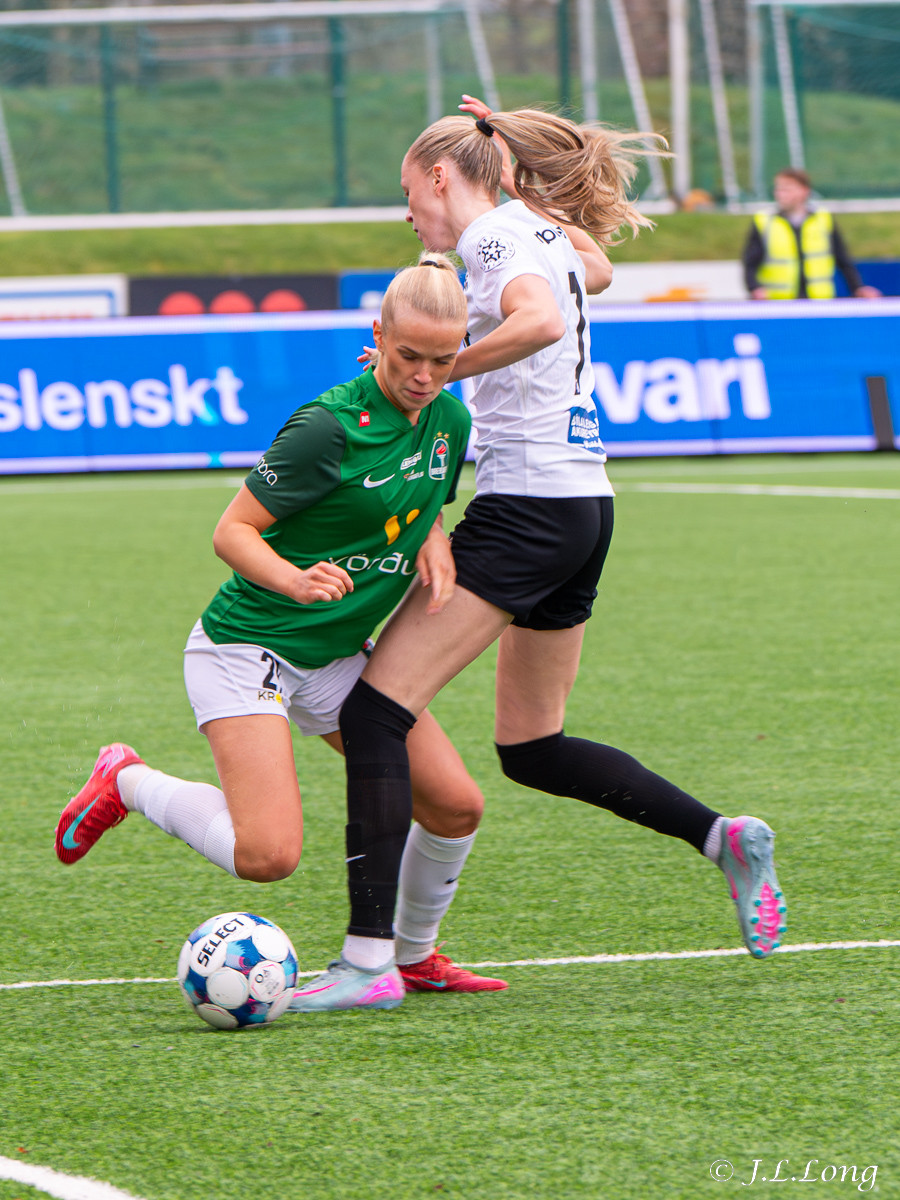 Boltinn skoppast inn í teignum en endar með skot frá Birnu Kristínu sem endar yfir markið.