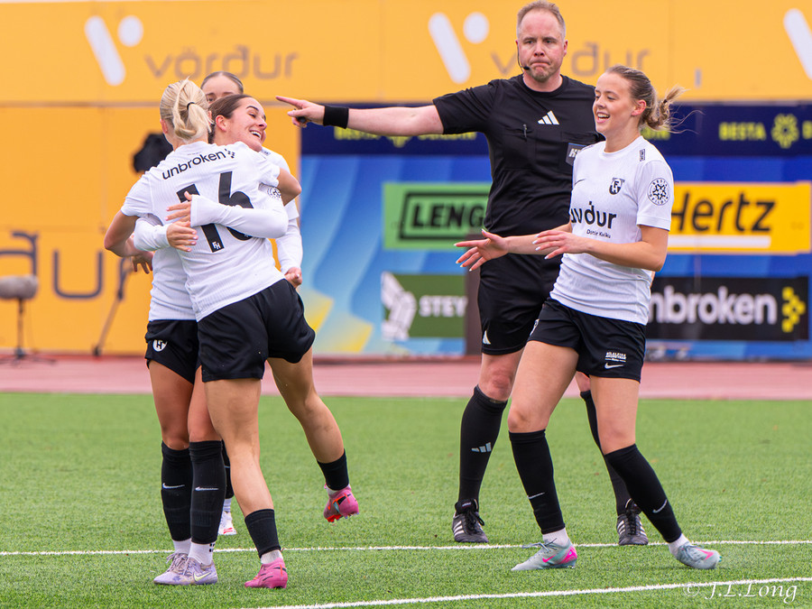 Þær voru ekki lengi af þessu. Hrafnhildur er kominn að hægri stöng og leggur boltann á Sammy sem er alveg opin á hinni stöginni og sparkar boltanum í opið mark.