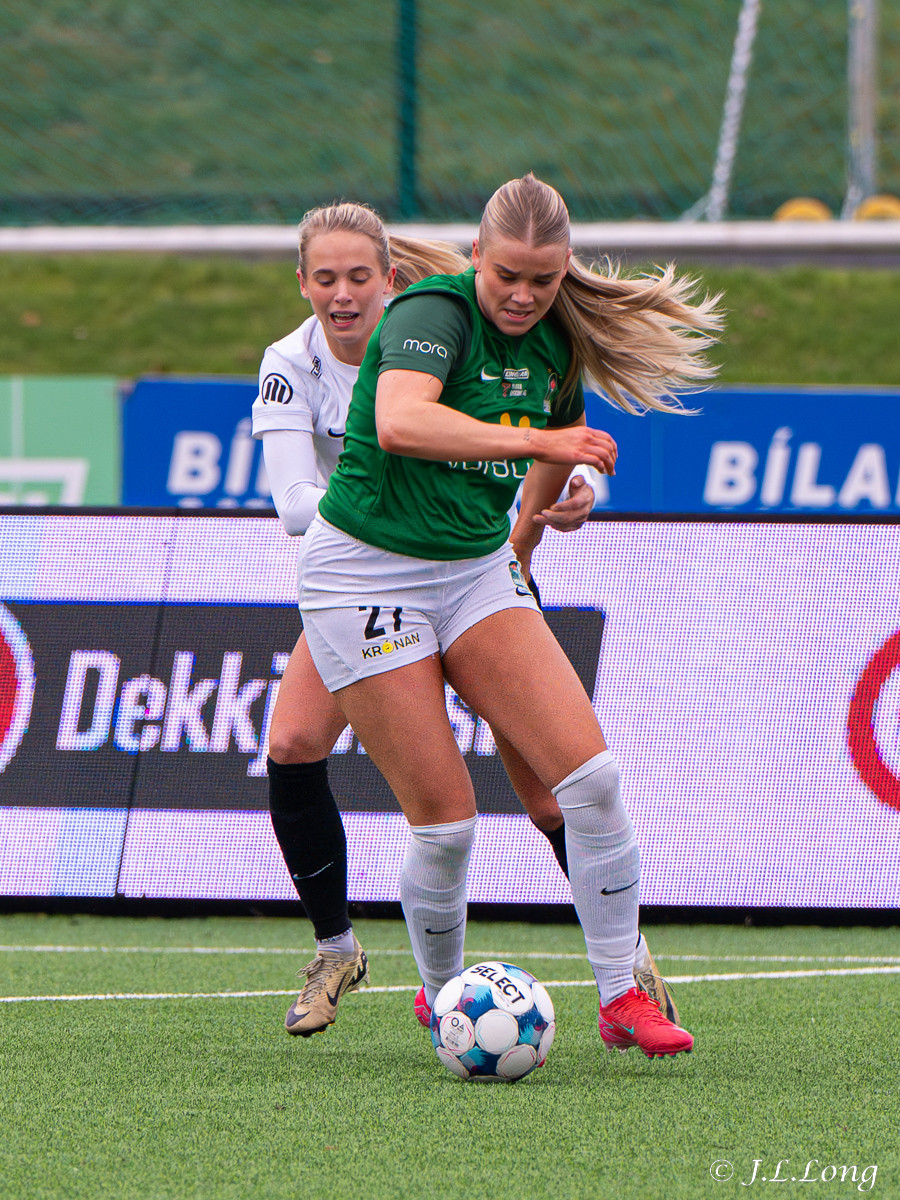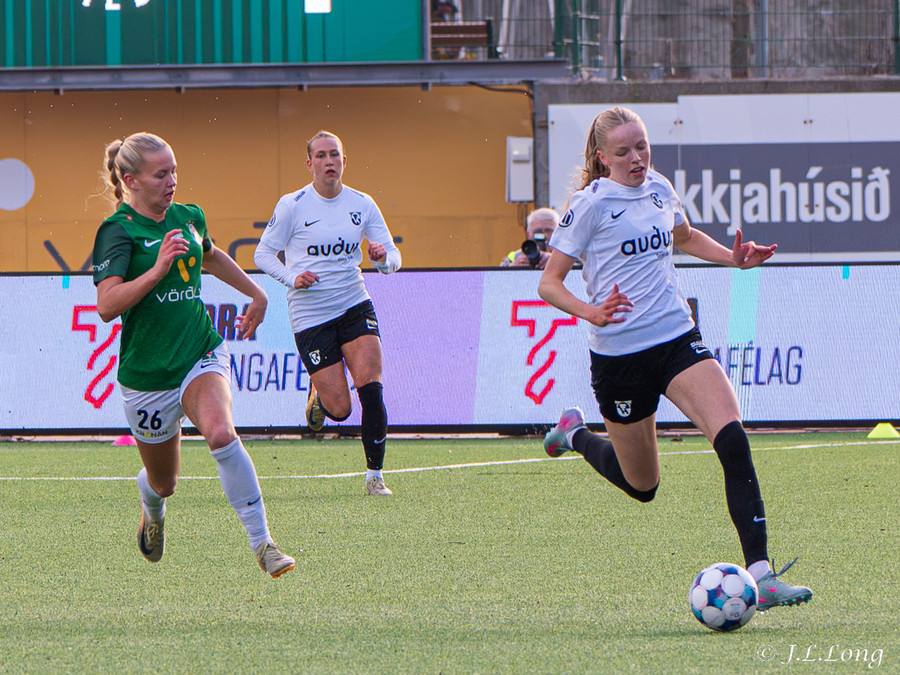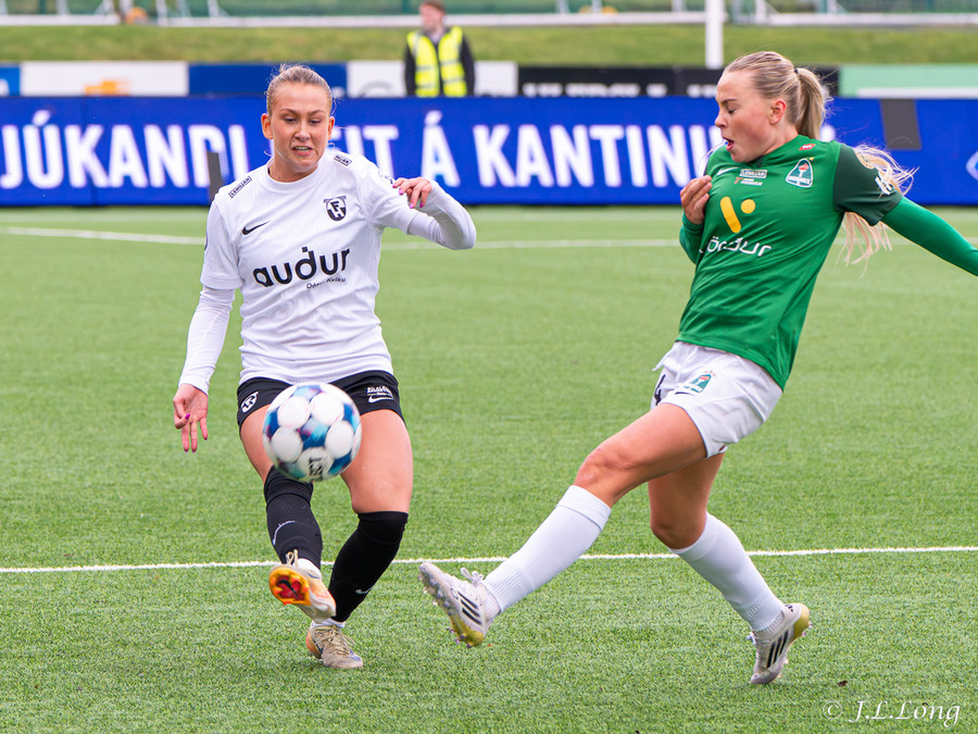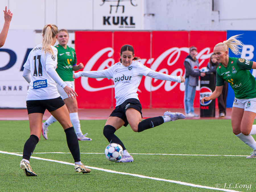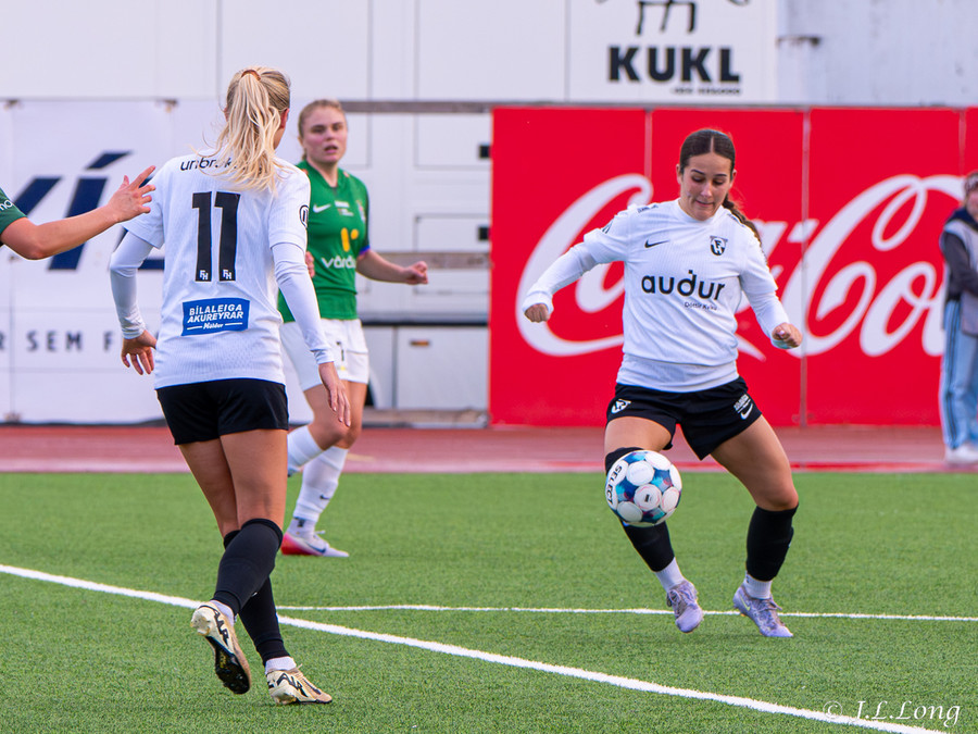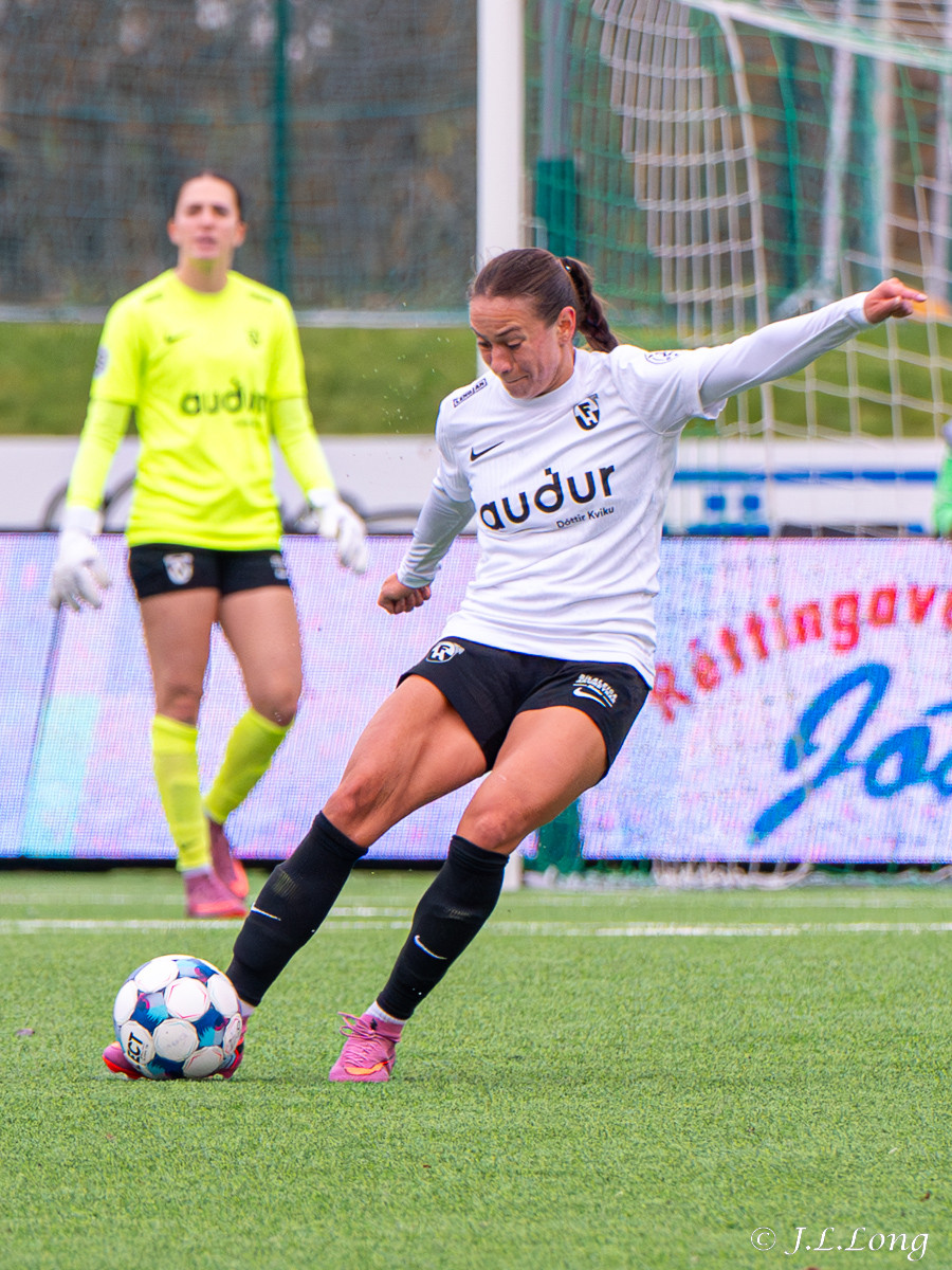 Thelma Lóa finnur Maya Lauren í mið teygnum. Maya tekur svo skotið og setur hann þægilega inn í markið.
