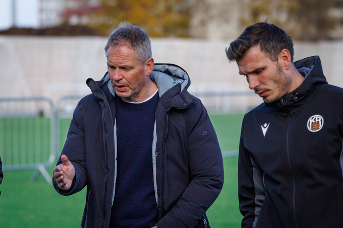 Halldór Snær, markvörður KR, fær sendingu til baka og er svellkaldur á boltanum. Bíður eftir pressunni og gefur á samherja rétt áður en að Oliver Heiðarsson nær að komast í boltann.