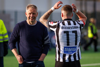 Aron Sig gefur fyrir úr aukaspyrnunni, boltinn á Finn Tómas sem skallar boltann á markið en Zapytowski ver örugglega.