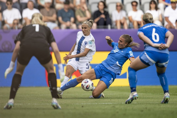 Ágætis tilraun hjá Íslandi, Sandra María fær boltann upp í horn setur hann niður á Hlín sem skilar honum á Sædísi,