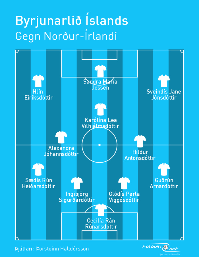 Norður-Írland virðast ætla að halda sig aftarlega á vellinum og hafa ekki verið að pressa öftustu línu Íslands sem fá að spila boltanum í rólegheitum þegar þær fá hann