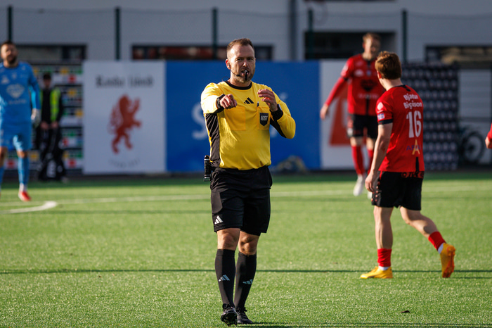 Sigurður Hjörtur Þrastarson er með flautuna og honum til aðstoðar eru þeir Patrik Freyr Guðmundsson og Eðvarð Eðvarsson.