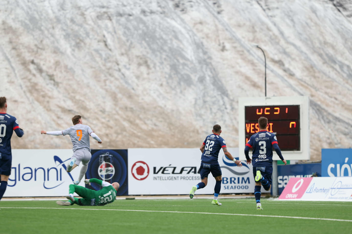 Spyrnan frá Aroni fer langt yfir mark Vestra.