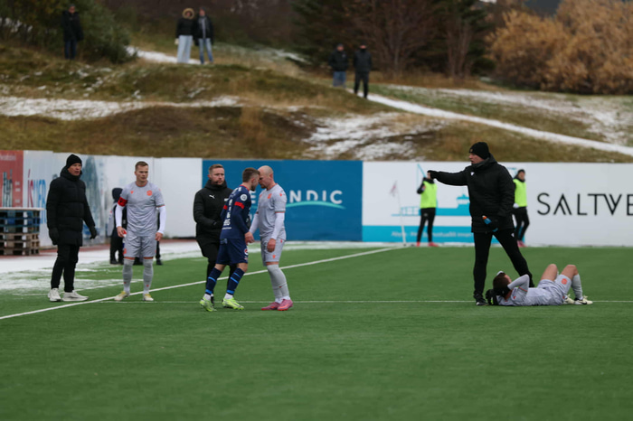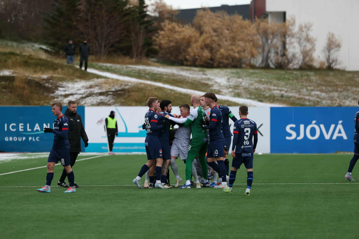 Túfa kemur boltanum í netið en Eðvarð lyftir flagginu.