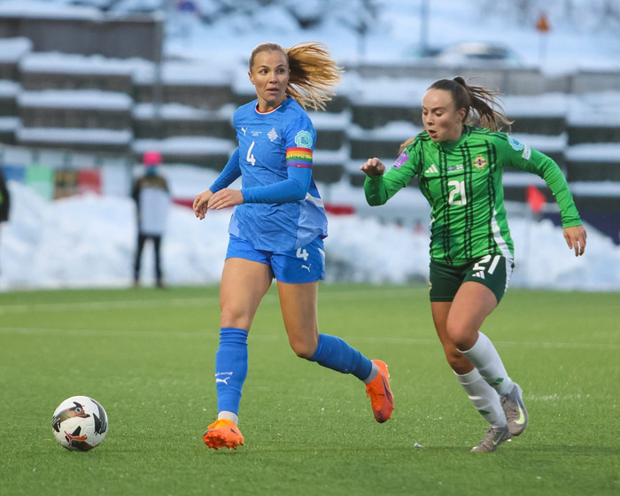 Hildur Antons kemst í góða stöðu og nær að setja boltann fyrir en þær Norður-Írsku ná að koma boltanum frá