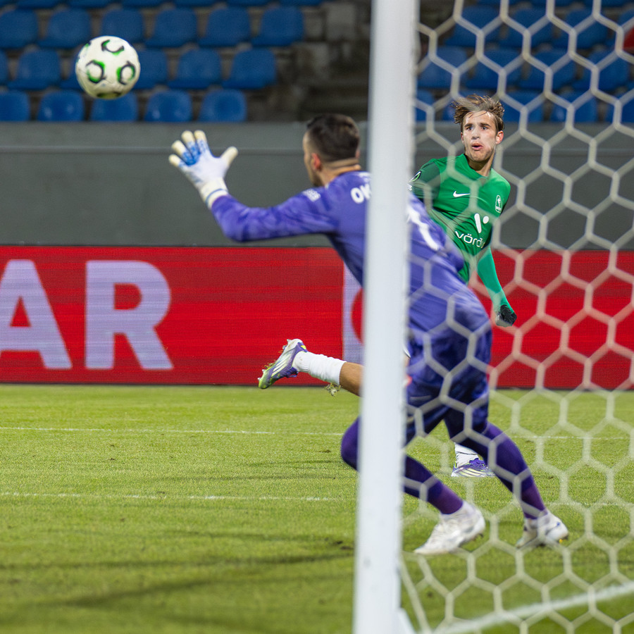 Logi með frábæra fyrirgjöf á Marius sem nær að setja boltann á Anton Ara sem ver hann eiginlega inn EN SEM BETUR FER ER HANN RANGSTÆÐUR!