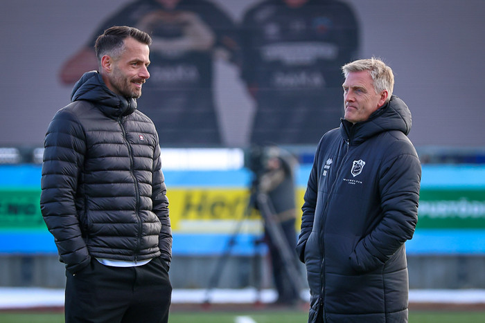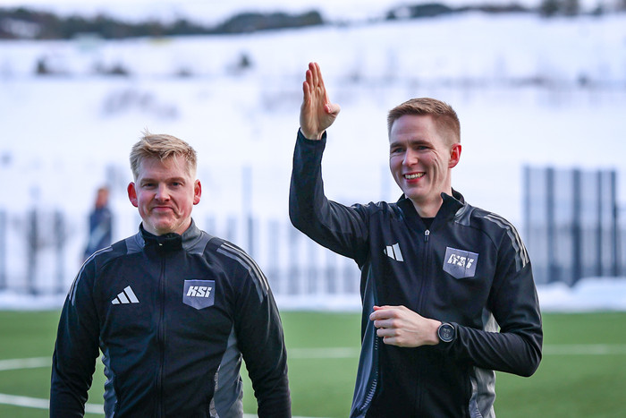 Liðin eru að hita upp og þjálfararnir tveir; Rúnar Kristinsson og Sölvi Ottesen, standa á miðlínunni og spjalla saman. Í græjunum er verið að spila lagið Þungur kross með Dimmu. Gott val.