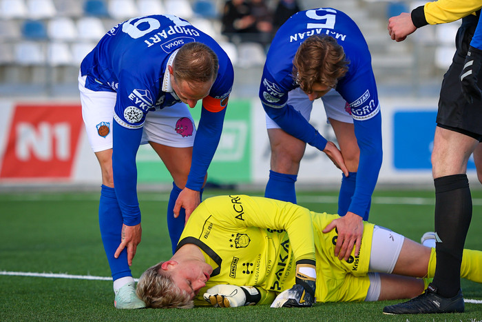 Fyrirgjöf inn i teig Fram. Viktor Freyr og Stígur lenda í samstuði í baráttu um boltann. Viktor markvörður Fram þarf aðhlynningu en getur haldið leik áfram.