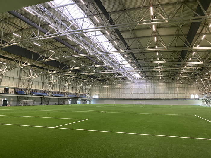 Tók ekki langan tíma í að boltinn fari í þakið. Daði Kolviður með hreinsun sem fór þangað