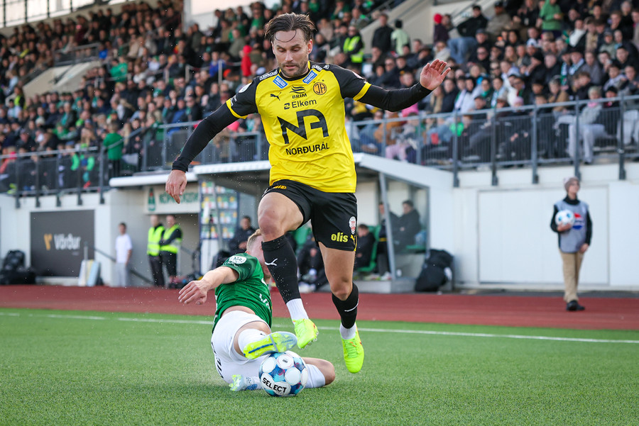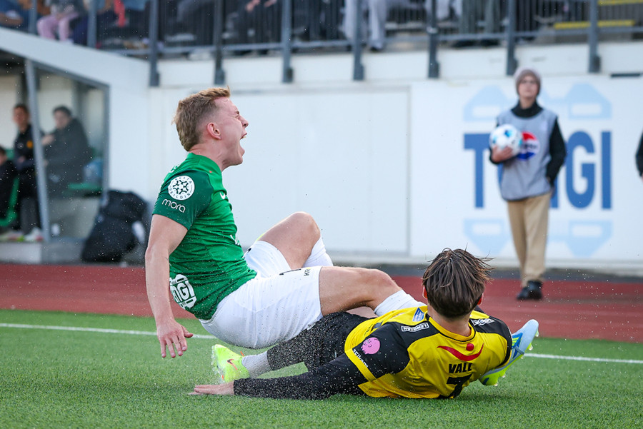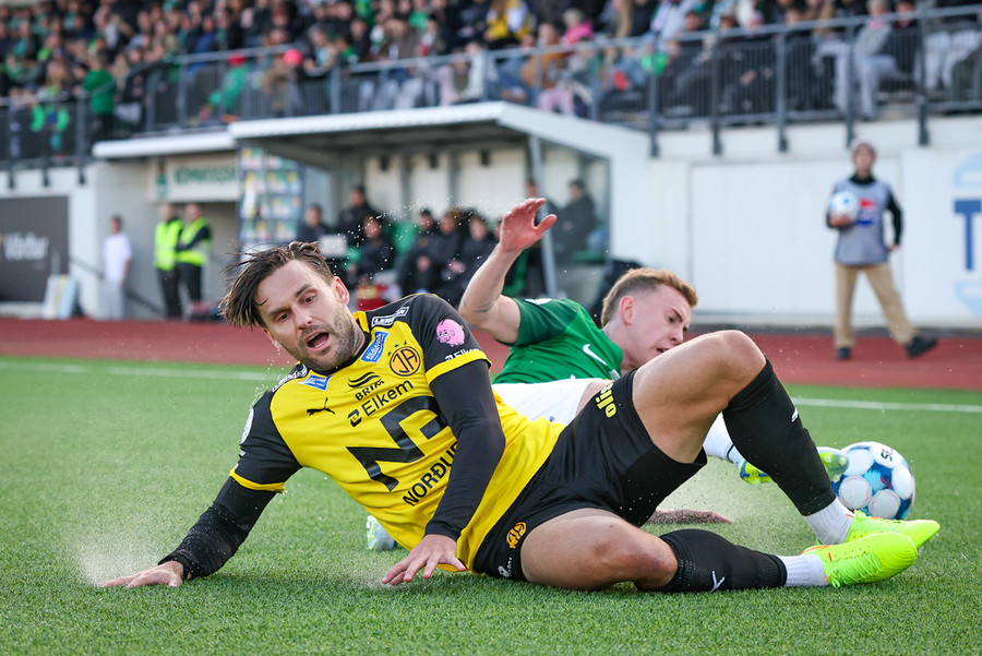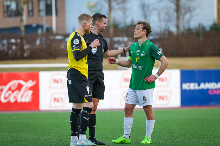 Rafael Máni fer í bókina eftir að hafa farið utan í Jónatan Guðna á sprettinum, Jónatan liggur eftir.