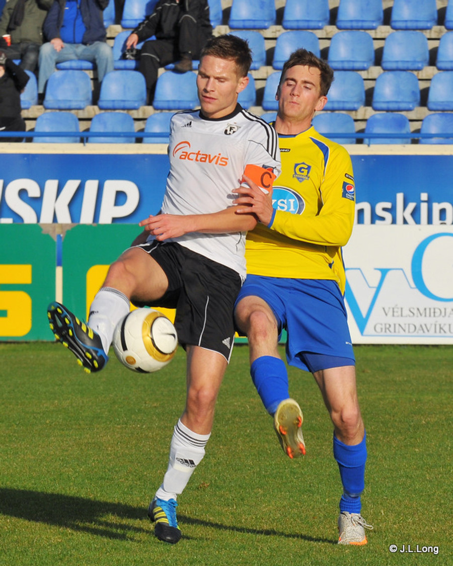 Það er ekkert af alvöru að gerast hérna í Grindavík. Liðin þreifa fyrir sér. FH átti rétt í þessu sitt besta færi þegar Atli Guðnason skaut rétt yfir markið.