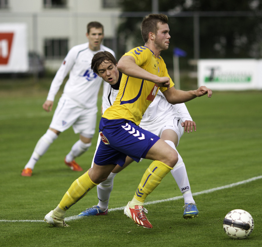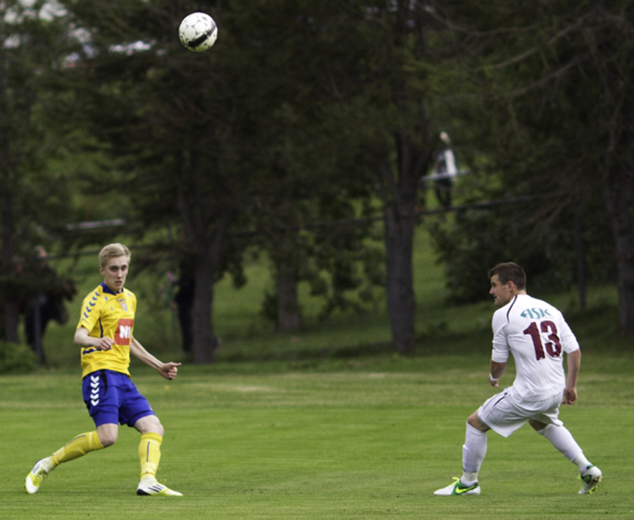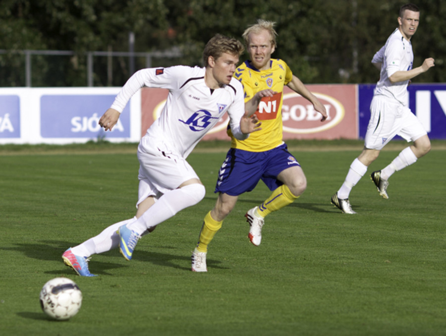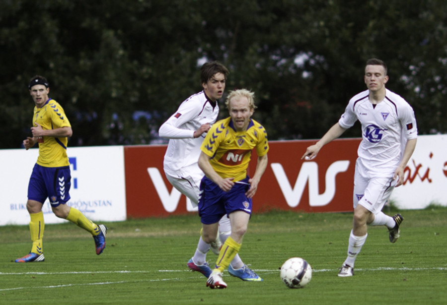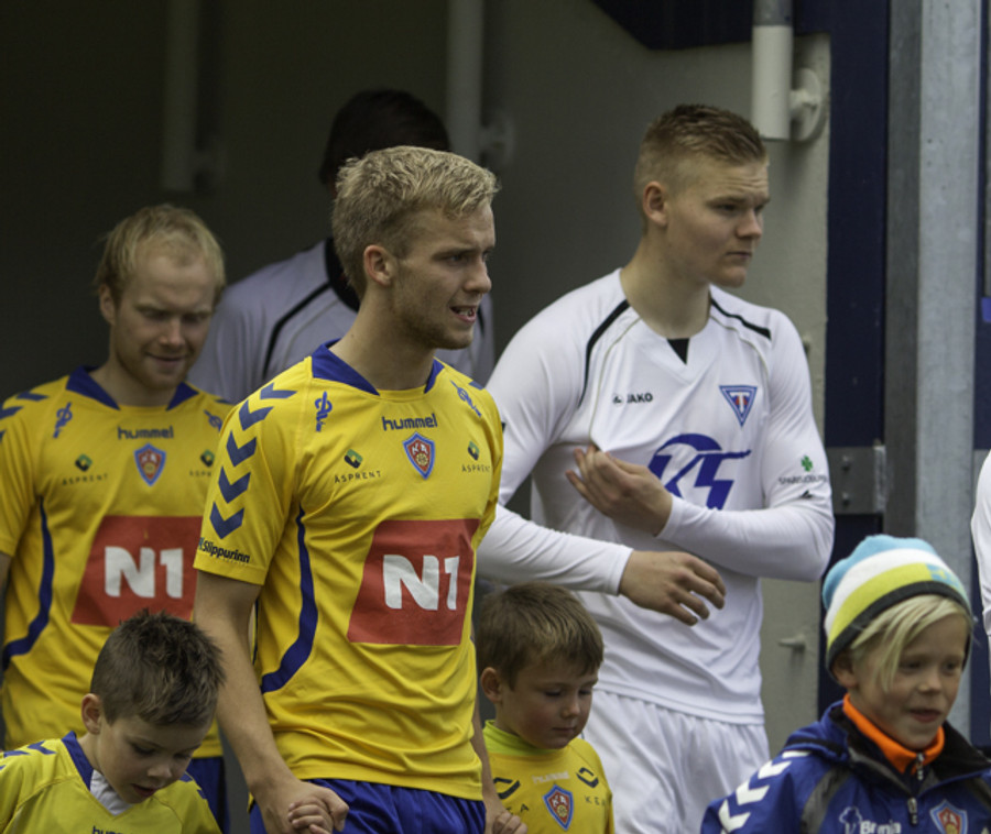 Gestirnir nálægt því að koma sér í færi hér snemma eftir góða sendingu fyrir markið frá Ingva Hrannari en boltinn endaði í fanginu á Sandor í marki KA eftir smá "pinnball" milli manna.