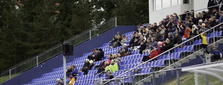 Þetta er ekkert grín gott fólk, ég gaf mér tíma og taldi alveg 39 stuðningsmenn sem eru mættir í stúkuna. Það er að vísu enn fólk að mæta á svæðið en þetta er ekki merkilegt, sólin er mætt á svæðið aftur á móti.