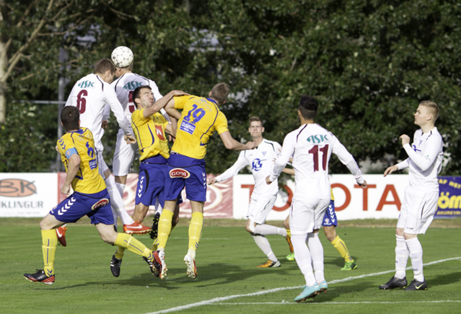 Heimamenn fá aukaspyurnu á hættulegum stað eftir að það er brotið á Bjarka Baldvins.