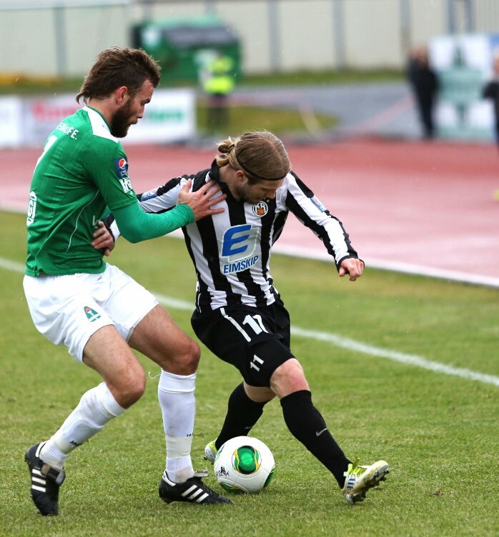 Óskar Örn Hauksson tók hornspyrnu. Rann í aðhlaupinu og sparkaði boltanum beint út af í markspyrnu. Mjög klaufalegt.