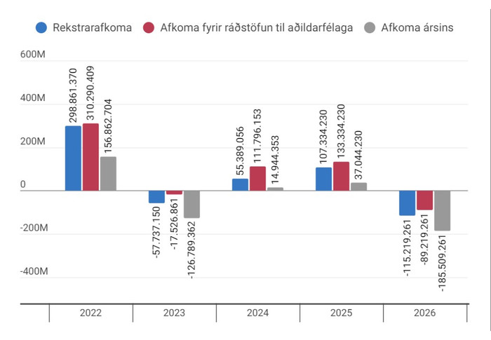 Ef ekki verður ráðist í aðgerðir gerir KSÍ ráð fyrir því að tap verði af rekstrinum sem nemi tæplega 185 milljónum króna. Miðað við áætlun ársins 2025 er gert ráð fyrir því að sambandið muni skila hagnaði upp á 37 milljónir króna. Ef við horfum yfir fimm ára tímabil, þ.e. 2021-2026, má sjá að afkoma ársins 2026 er sú lægsta á umræddu tímabili, að því gefnu að ekki verði ráðist í aðgerðir. Uppsafnað tap á þessu fimm ára tímabili nemur rúmlega 103 milljónum króna, en þó hefur rekstrarafkoman verið jákvæð upp á tæpar 289 milljónir króna á þessu tímabili.
