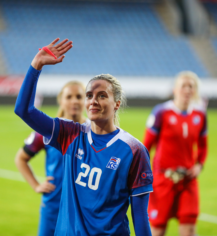 „Ég held að Instagrammið mitt hafi bara sprungið þegar ég kom hingað. Maður er að fá skilaboð frá hinum og þessum og bónorð frá fólki út í heimi. Þetta er bilað en það er gaman að þessu,“ sagði knattspyrnukonan öfluga meðal annars en hægt er að hlusta á allt viðtalið við hana hér að neðan.