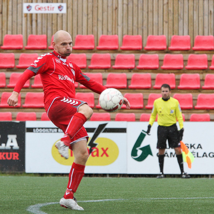 Sigurbjörn Örn Hreiðarsson spilandi aðstoðarþjálfari Hauka var í borgaralegum klæðum á hliðarlínunni í dag er Haukar báru sigur úr bítum í viðureign sinni gegn Fjölni 1-0. Hann var að vonum ánægður með sigurinn og að hafa haldið hreinu.