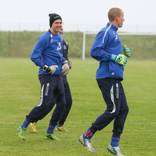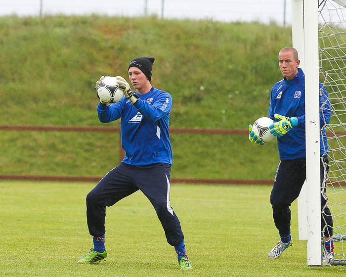 Gunnleifur Gunnleifsson (Breiðabliki) og Ögmundur Kristinsson (Fram) eru að undirbúa sig undir leiki með félagsliðum sínum í Pepsi-deildinni á morgun og því var Hannes Þór Halldórsson (Sandnes Ulf) eini markvörðurinn eftir í hópnum.