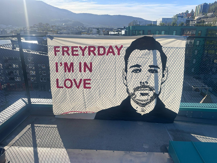 Á þessum borða, sem fjallað var um hér á Fótbolta.net fyrir stuttu, mynd af Frey og textinn "Freydray I'm in Love" sem er tilvísun í frægt lag með The Cure.
