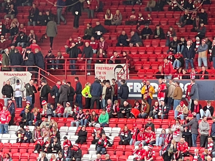 Það er gaman að sjá hvað Freyr Alexandersson er vinsæll hér í Bergen. Á heimavelli Brann má sjá borð með andliti hans.