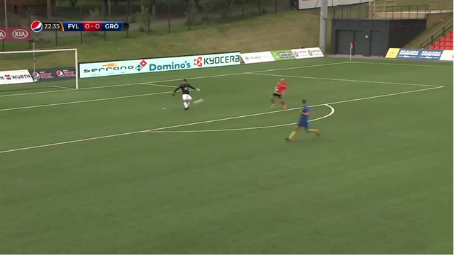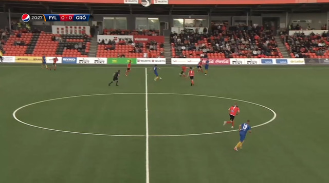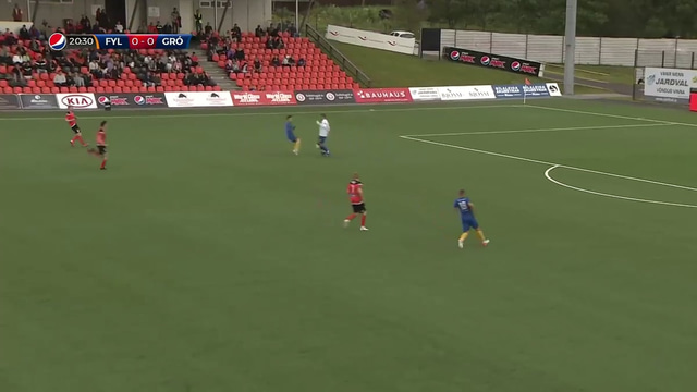 - Eftir óhreint uppspil Fylkis á 17 mínútu vinna Gróttumenn boltann og sennilega er sending á Pétur misheppnuð sem skapar misskilning milli Helga Vals og Orra og boltinn berst til Kristófers.