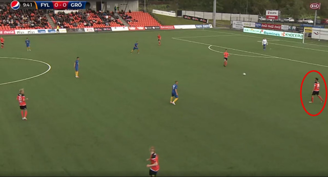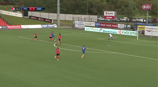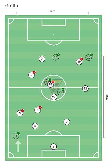 Þetta var augljóslega búið að æfa nokkuð vel. Nokkrum sinnum féll hann niður á milli hafsentana sem gátu þá borið boltann upp. Sem var fín lausn gegn pressu Gróttumanna. Einkum Ásgeir sem kom svo með langan bolta horn í horn á PW sem var ætlað að skapa út frá því.