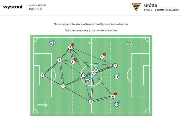 Hluta skýringarinnar var að finna í því að miðjurnar spegluðu hvor aðra, þ.e. Grótta var með tvo dýpri miðjumenn og einn fremri og Fylkir með einn djúpan og tvo fremri. Þá breytist miðjuspilið auðveldlega í maður á mann keppni. Í jöfnum leikjum verður niðurstaðan því lítið flot í leiknum og mikil barátta. Það var niðurstaðan hér. Meðal annars þess vegna sést hversu lítið virk miðja Gróttumanna var í spilinu.