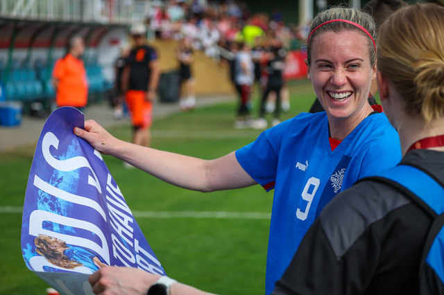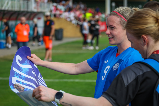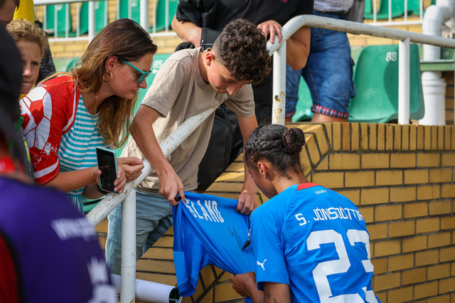 Hér fyrir neðan má sjá myndir af því þegar Sveindís Jane Jónsdóttir, sem leikur með Wolfsburg, gaf áritanir eftir leik.