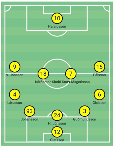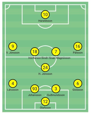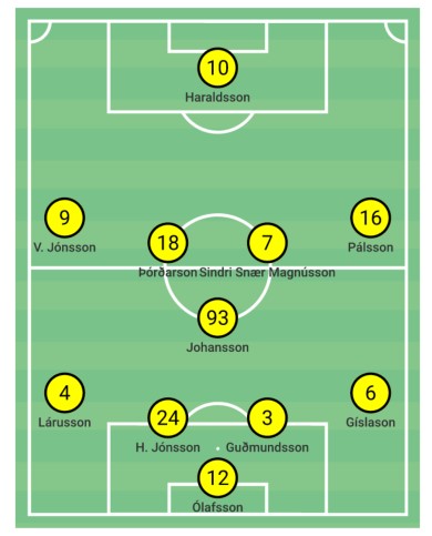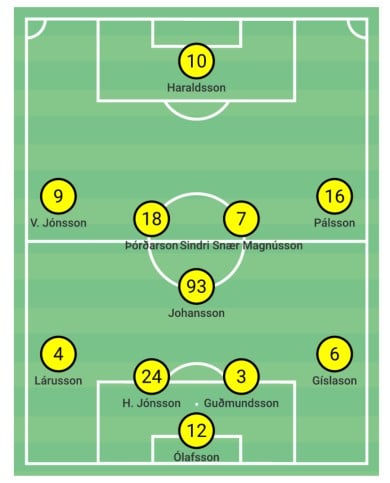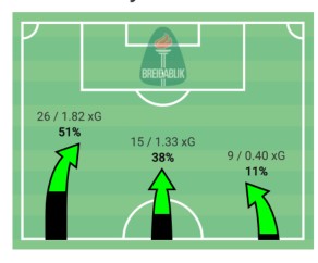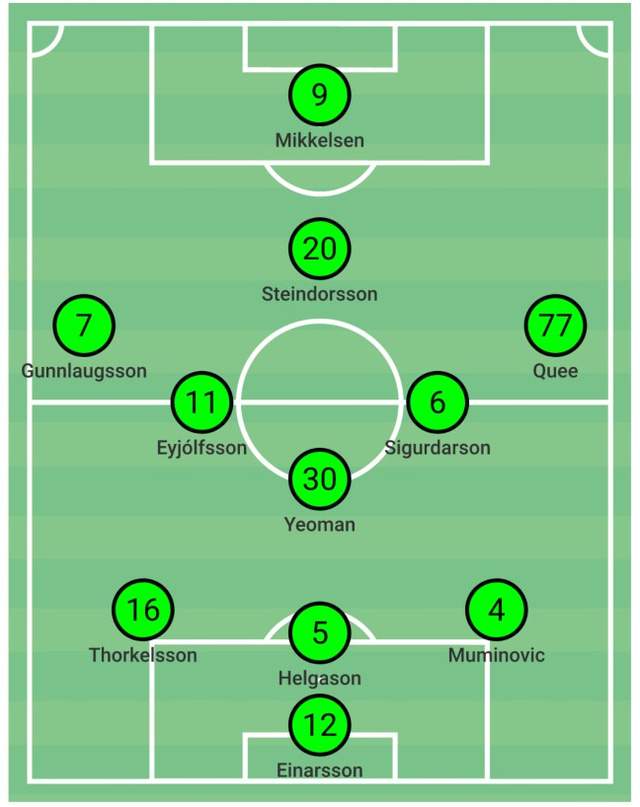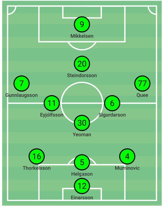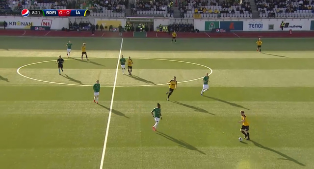 Dekkarar koma inn í markteig, sweeper-inn Elfar ýtir upp og spilar sem djúpur miðjumaður og Andri Yeoman er síðan bjóða sig einni línu hærra. Miðjumennirnir Gísli og Alexander fara hærra til að búa til pláss fyrir framan sig. Vængbakverðir fara alveg upp og pinna aftur öftustu línu ásamt senterum. Þarna byrjar mómentið með því að Anton spilar á Róbert sem spilar strax til baka á Anton.