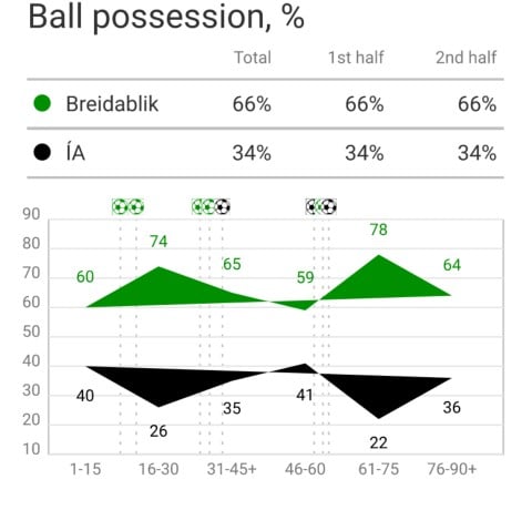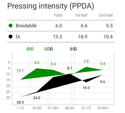 Mikið tempó var í pressu Blikanna og þar fór Alexander Helgi mikinn, steig upp af miðjunni og setti stöðugt pressu á öftustu línu og miðjumenn ÍA. Skagamenn fengu engan tíma á boltanum og sóttu stöðugt inn í svæðin sem Blikarnir lokuðu sem auðveldaði Blikunum að trufla samleik þeirra. PPDA mælikvarðinn sýnir glögglega hversu mikill munur var á þessum þætti leiksins í fyrri hálfleiknum. En í byrjun síðari hálfleiksins komu Skagamenn eins og særð ljón út í leikinn og náðu að trufla Blikana og hrista upp í leiknum.