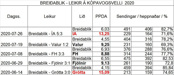 Það sem var kannski skrýntast voru ummæli þjálfara Skagamanna um að fáir hafi kjark til að spila fótbolta og pressa gegn Blikunum á Kópavogsvelli. Séu sendingamynstrin borin saman sést að takturinn í leik liðanna er gjörólíkur ennfremur að einungis Grótta var með færri pressumóment (PPDA) en ÍA á Kópavogsvelli á þessari leiktíð.