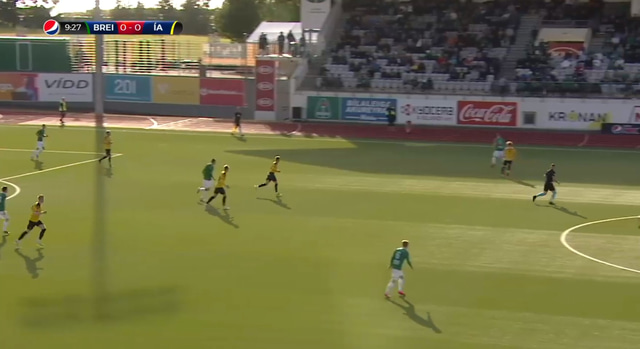 Vegna þess að upphafsmómentið er rangt hjá Skagamönnum eru þeir búnir að tapa þessari baráttu. Bara mistök hjá Blikunum geta núna komið í veg fyrir að þeir komist fram völlinn. Róbert leggur af stað og Elfar er tilbúinn að flytja boltann lengra. Róbert spilar á Elfar sem snýr og þræðir boltann út á Gísla sem hefur mikið pláss að vinna með því vængbakverðir Blikanna eru hátt.