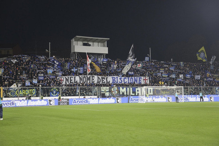 Hann var með öðrum ultras stuðningsmönnum Inter fyrir aftan mark sinna manna í fyrri hálfleik en Emil Audero, sem lék hjá Inter á láni tímabilið 2023-24, var á milli stanga Cremonese. Hann færði sig yfir á hinn vallarhelminginn fyrir seinni hálfleikinn og var þá með stuðningsmenn Inter bakvið sig.